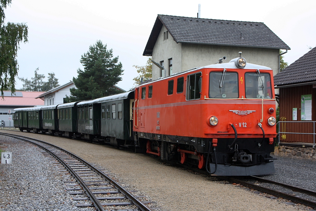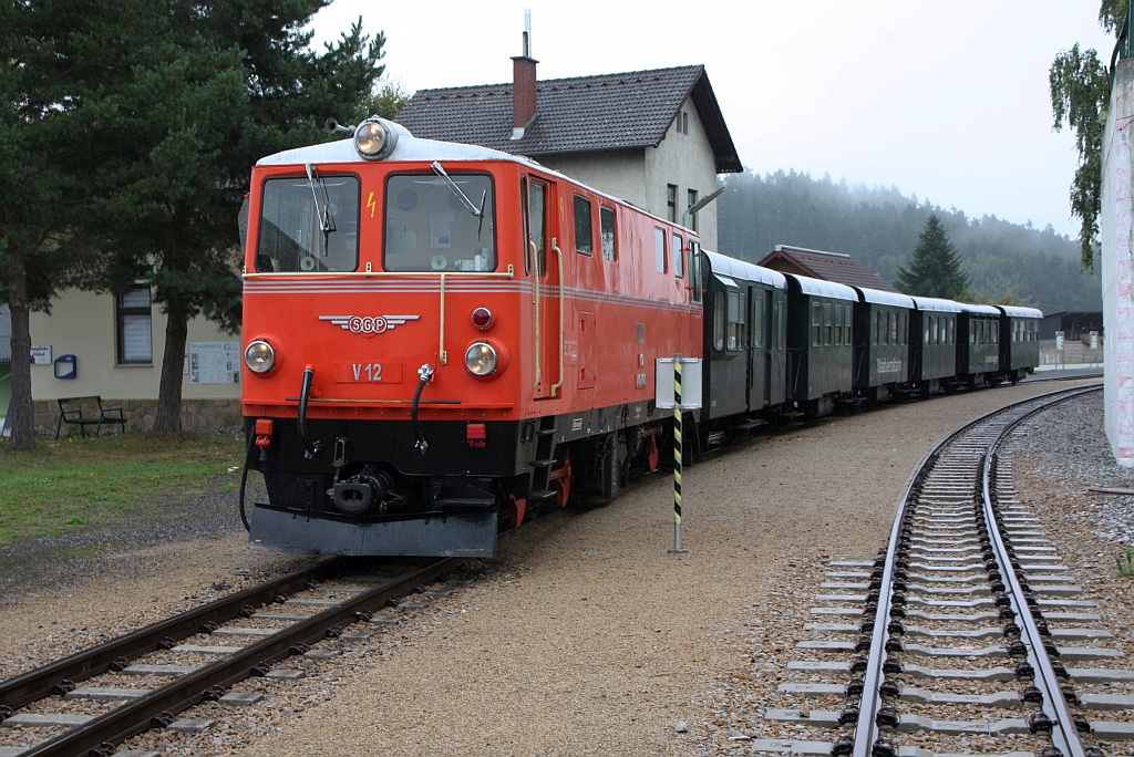 NOVOG V12 (ex ÖBB 2095.12, Hersteller: SGP-Floridsdorf, Bauj.: 1961, Fab.Nr.: 18156) am 24.September 2025 mit dem P 16904 nach Gmünd im Ausgangsbahnhof Groß Gerungs. Karl Seltenhammer