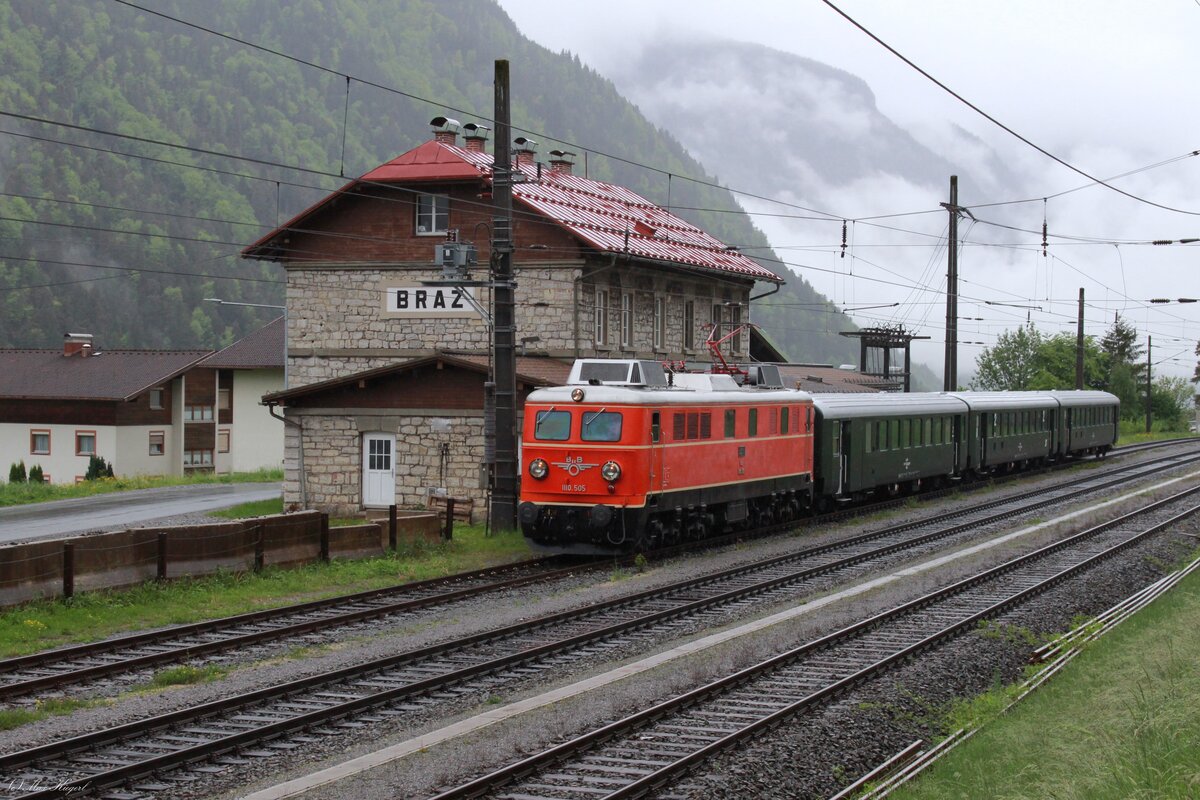 Der 5.5.2025 war ein kühler verregneter Tag was die 1110.505 von ProBahn Vorarlberg weniger zu schaffen machte als manchen Fotografen.