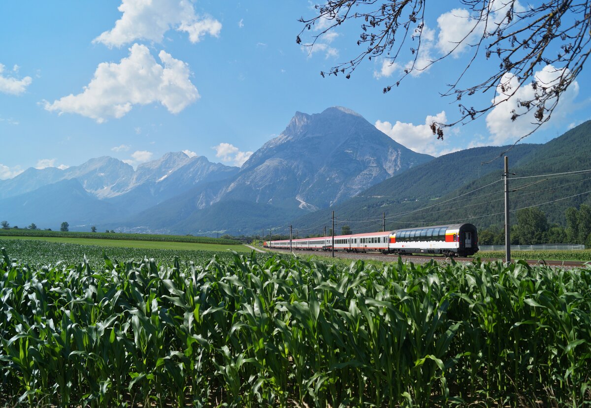 Der RJX 165 von Zürich HB nach Budapest-Keleti wurde am 19.04.2025 von der optisch sehr ansprechend gestalteten Strauss-Werbelok 1116 216 traktioniert. Kurz vor Innsbruck konnte die Leistung unmittelbar hinter der Haltestelle Kematen in Tirol auf der Fahrt nach Osten aufgenommen werden.