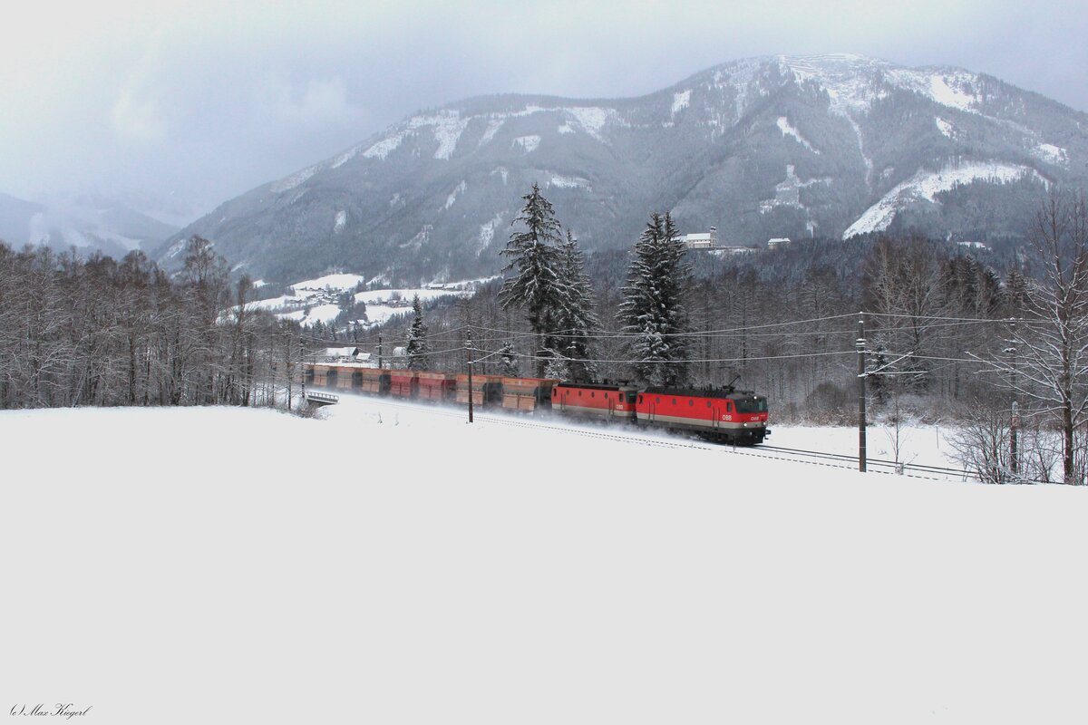 Die 1116 261 und die 1116 124 rollen am 18.2.2026 mit einem Kohlezug von Koper Luka nach Linz Stahlwerke kurz vor dem Bahnhof Admont durch das verschneite Ennstal ihrem Ziel entgegen.
