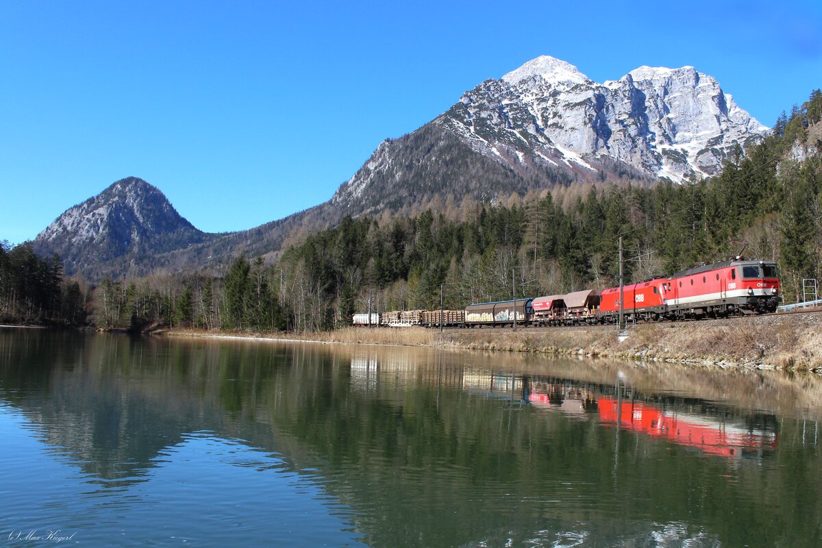 Am Fuße des 2224m hohe Große Buchstein entlang der aufgestauten Enns kurz hinter Gstatterboden rollt am 6.6.2025 die 1116 043 mit einem Erzzug von Jesenice kommend nach Linz Stahlwerke.