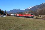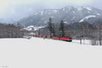 Kurz vor dem Bahnhof Admont fahren am winterlichen 18.2.2026 die CargoServ 182 581 und die 193 826 mit einem Stahlganzzug von Tarvisio Boscoverde nach Linz Stahlwerke ihrem Ziel entgegen.