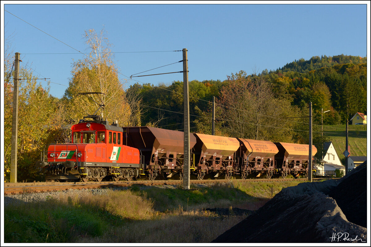 Eine einzige Elektrolokomotive, nämlich E-41, kommt ab und zu auf der Gleichenberger Bahn zum Einsatz. Hier am 23.10.2021 im Zuge einer Fotosonderfahrt auf dem nicht öffentlich zugänglichen Betriebsgelände der Fa. Appel Steinbruch GmbH. Der Zug wurde im schönsten Licht auf dieser Anschlussbahn extra für die Fotografen aufgestellt, und so konnten der Zug unter Aufsicht der Betriebsleitung in nur jeder erdenklichen Form fotografiert werden. Hier wird übrigens Basalt (Vulkanlandschotter grau) u.a. für die Eisenbahn verladen. Hanspeter Reschinger