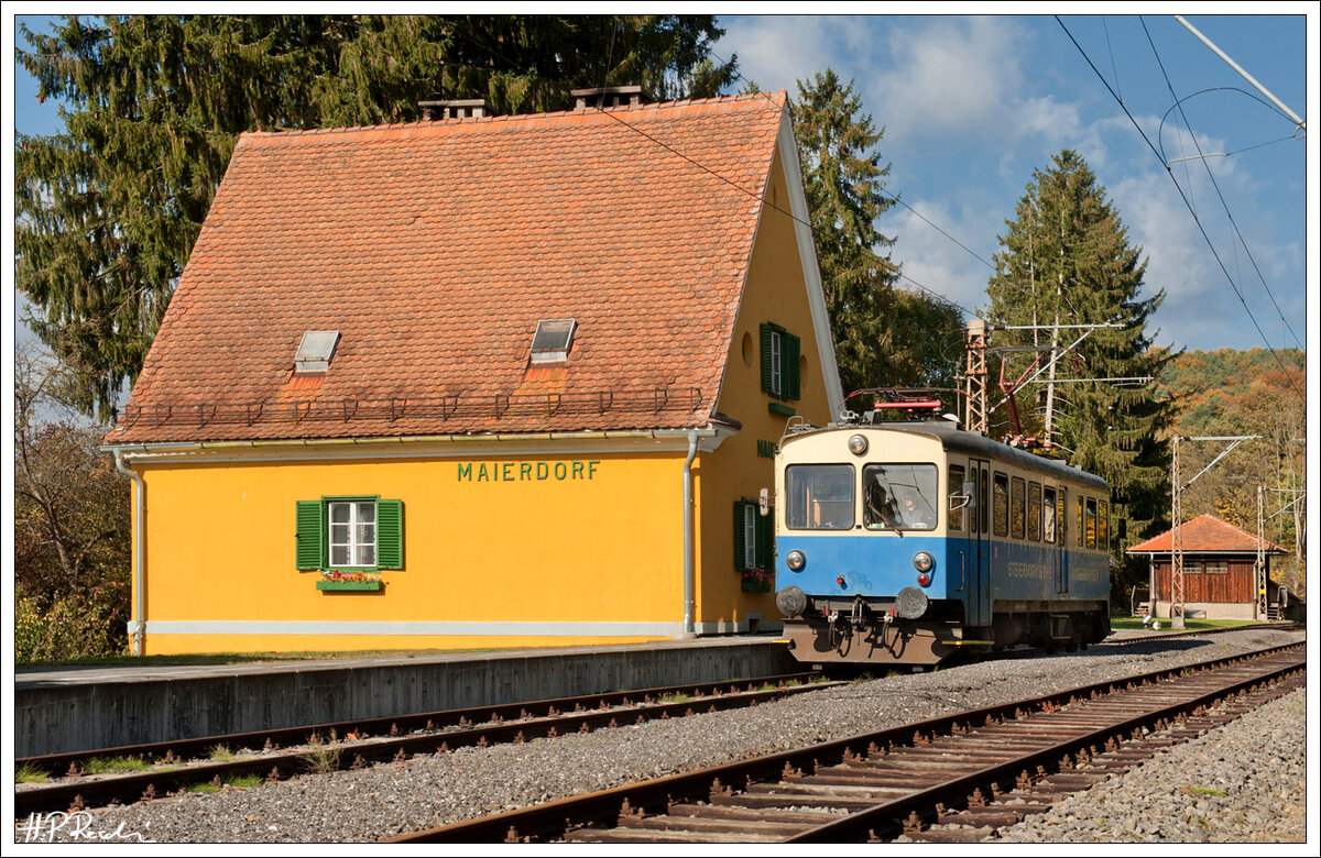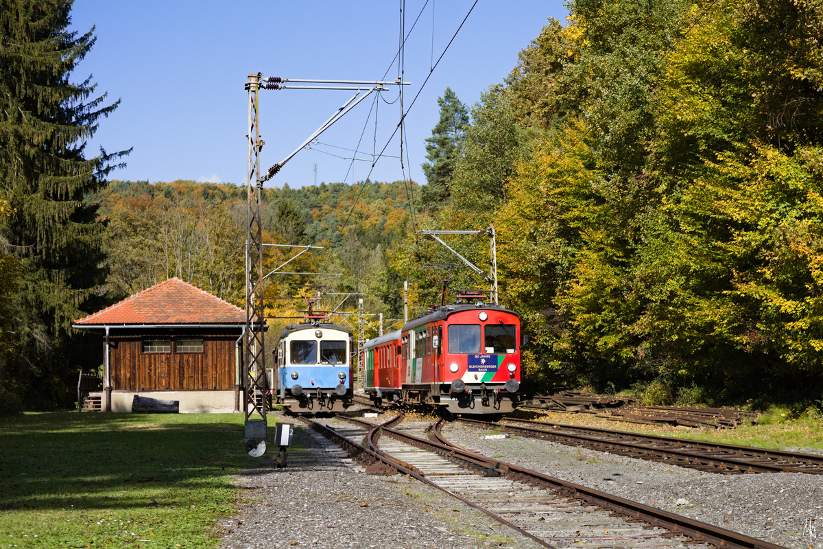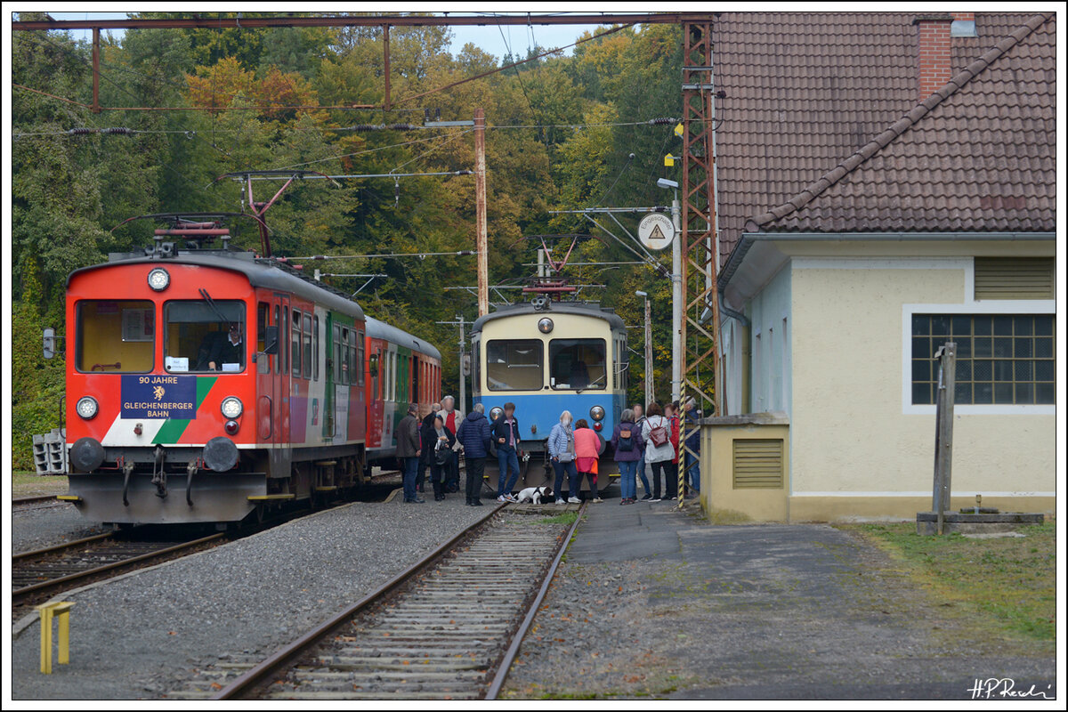 Zugkreuzung in Maierdorf. Links der Fotozug mit ET1, der nach Bad Gleichenberg weiterfährt, rechts der Planzug mit dem ET2 auf der Fahrt nach Feldbach, der für eine Reisegesllschaft sogar noch um einen Schlierenwagen verstärkt werden musste. (23.10.2021) Markus Pöschl