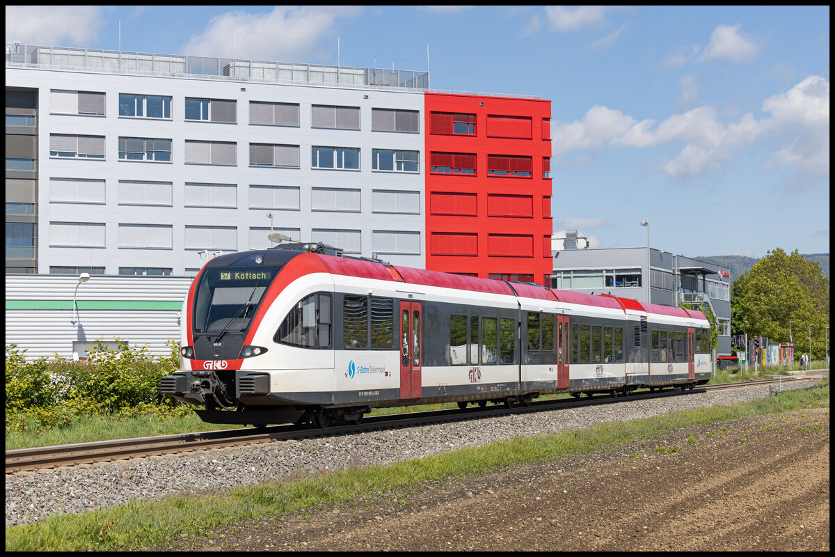 Graz. Ein Wolkenschaden, wie er im Bilderbuch steht: Der GKB-DoSto Steuerwagen 8629 202 fährt hier am 17.05.2024 als S7 in den Bahnhof Straßgang nach Wie-Eibiswald ein.