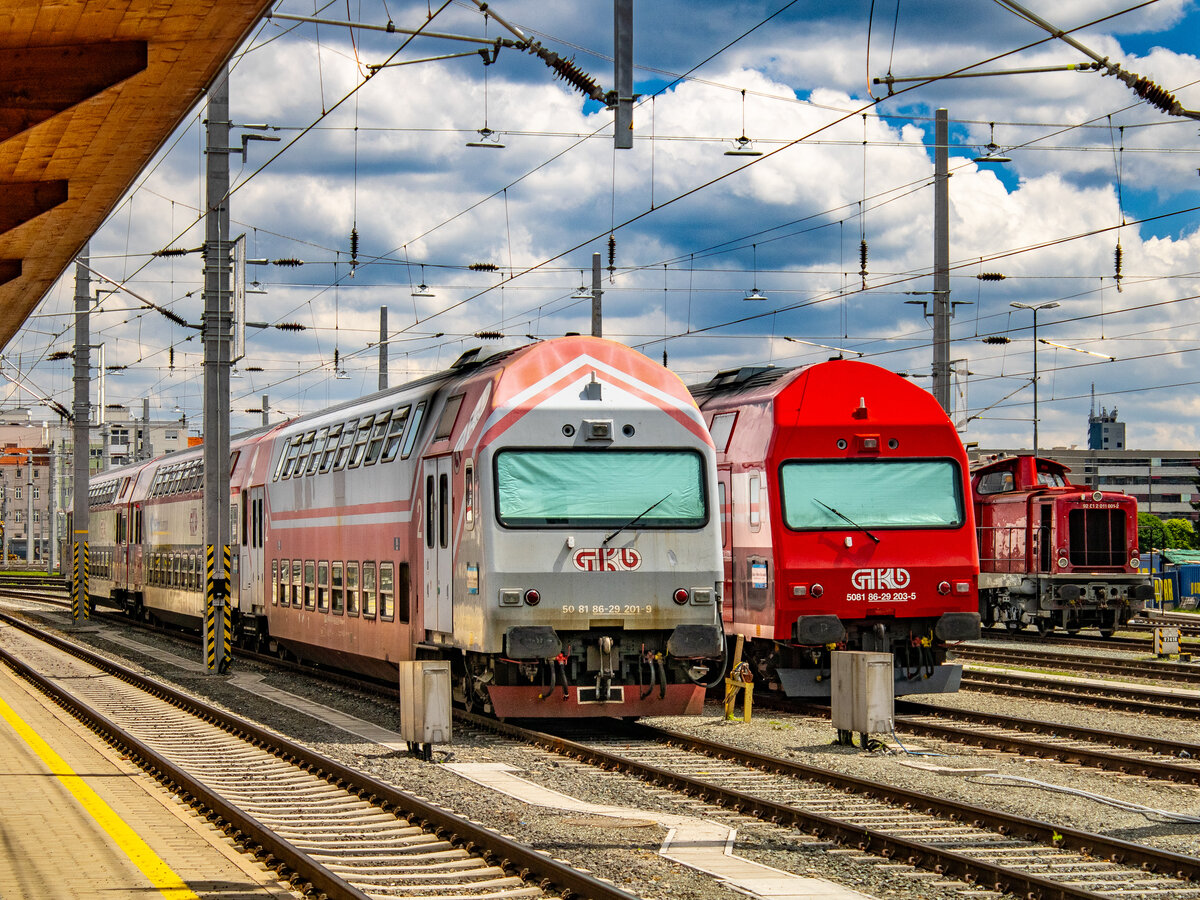 Graz. Ruhe vor der Hauptverkehrszeit: Zwei Doppelstock-Garnituren in unterschiedlichen Lackvarianten der GKB warten auf ihre nächsten Einsätze am 15.05.2024 im Graz Köflacherbahnhof.