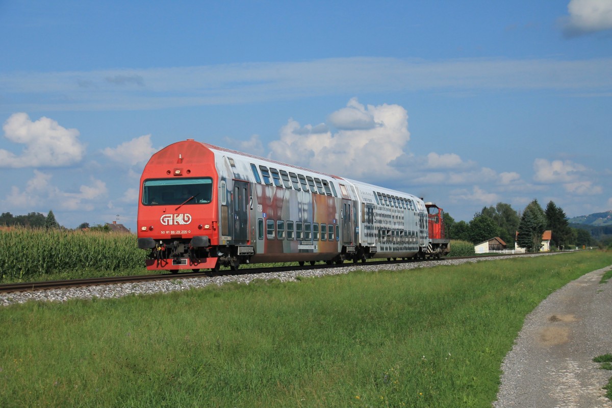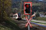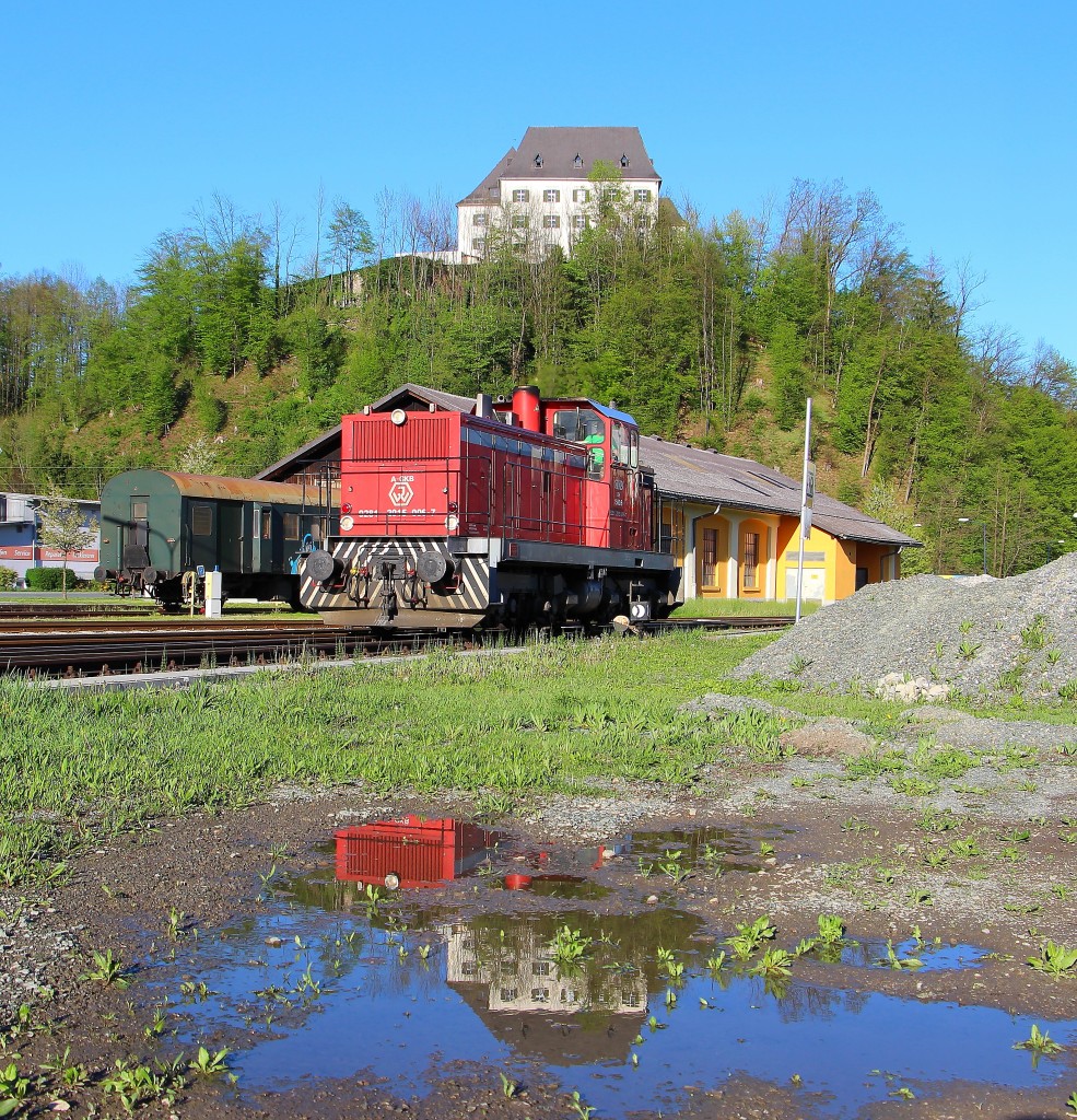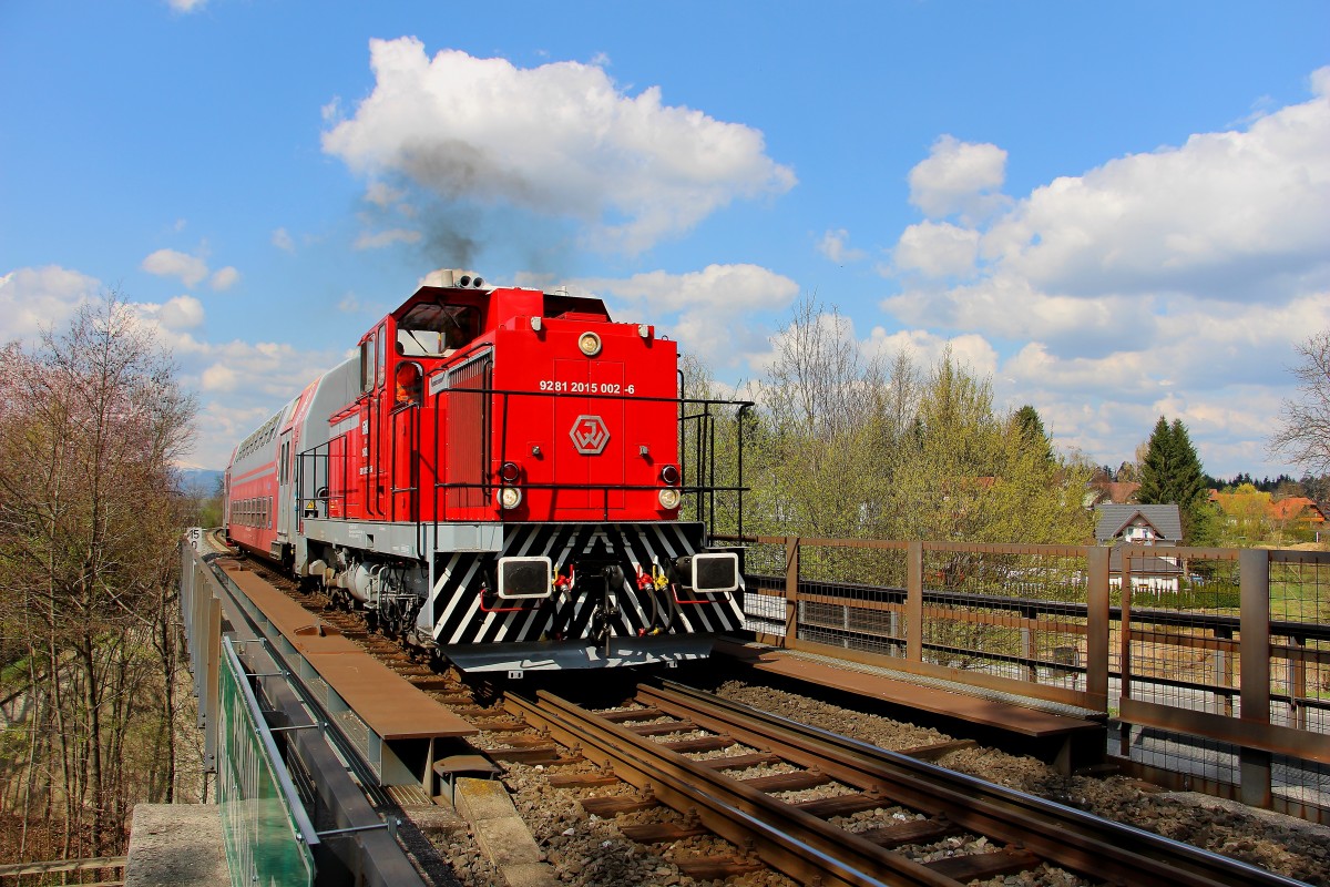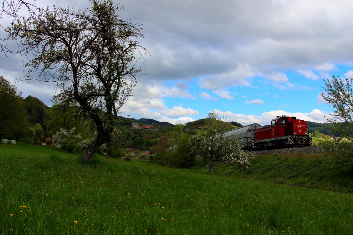 Durch nachwievor fehlende Ausrüstung mit PZB 90 aller Doppelstocksteuerwagen der GKB wird R8567 Lok Vorraus geführt. Über die Wintermonate Übernahm diese Leistung RTS 2016.906. Nun kommen wieder die eigenen Triebfahrzeuge der Reihe 1500 zum Einsatz . Hier im Bild zu sehen DH1500.6 unter der noch nicht ganz zugewachsenen Kulisse des Schlosses Burgstall zu Wies in dem sich eine Hauashaltungschule befindet. 9.April 2014 Karl Heinz Ferk
