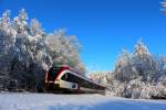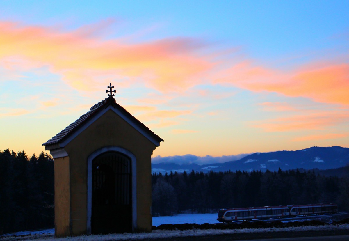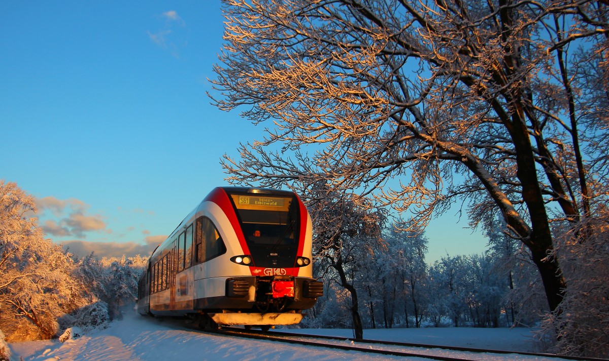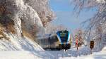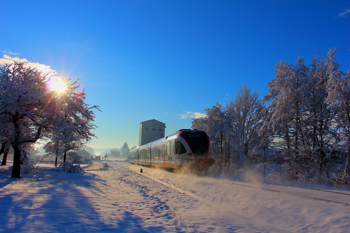 Der Frühe Ferk fängt den GTW :-) R8555 am Morgen des 25.1.2014. 1 Monat nach Weihnachten ist der langerwartete Schnee gekommen und hüllt die Weststeiermark in ein wunderbares weißes Kleid das an diesem Morgen durch Sonnenstrahlen veredelt wird. Hier bei der Anfahrt auf die Halte und Ladestelle Schwanberg. Karl Heinz Ferk