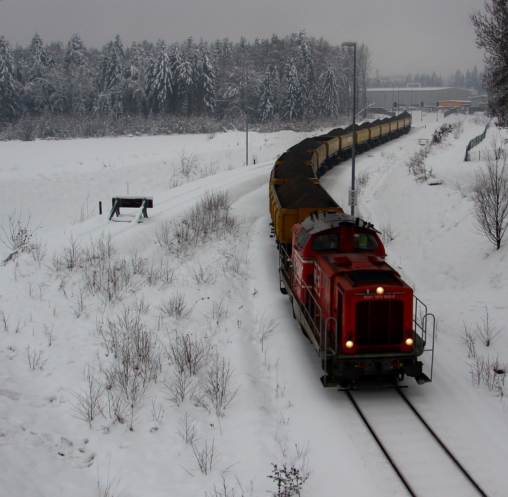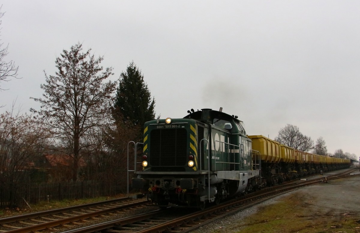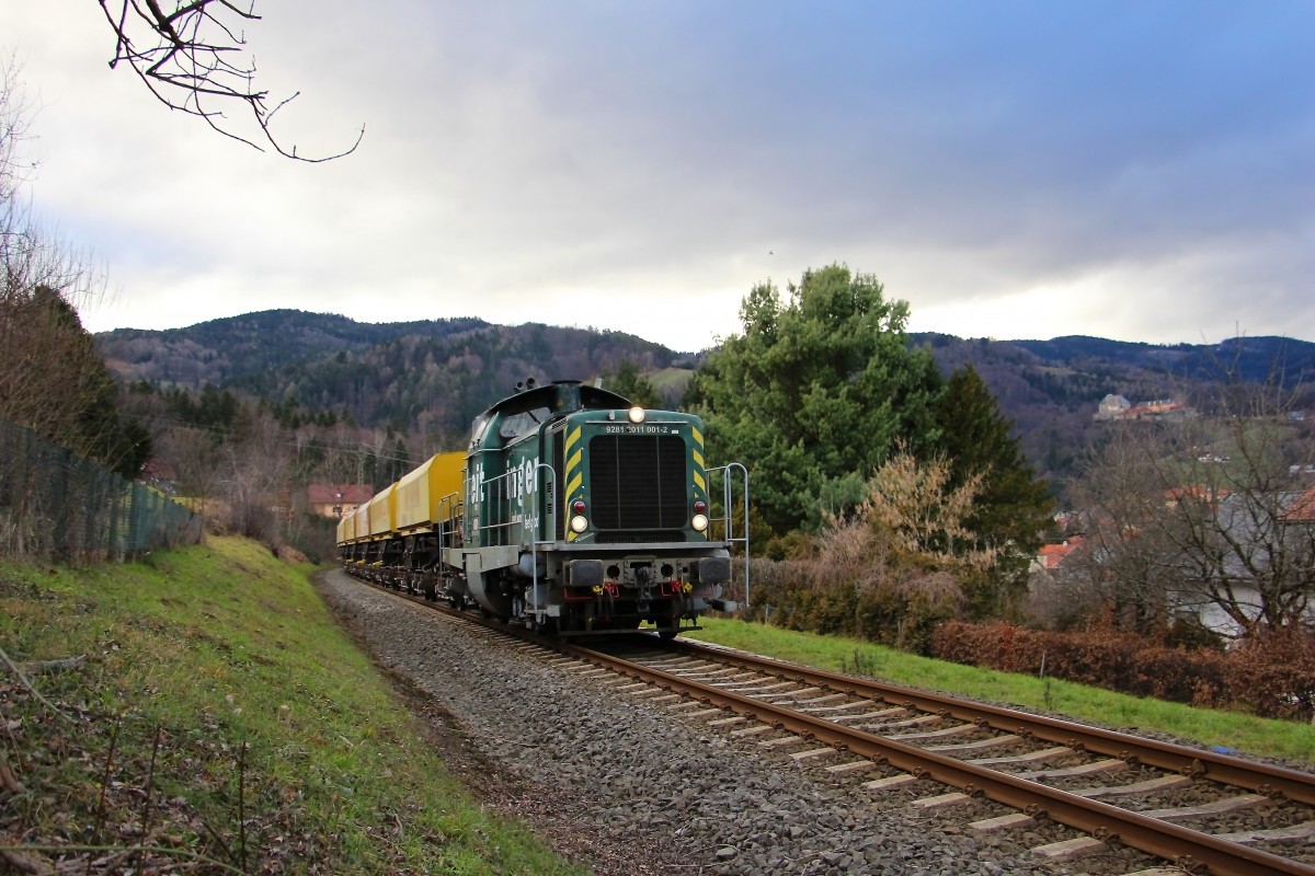 Anders als in weiten teilen Kärntens und Südtirols hat sich der starke Schneefall am Freitag dem 31.1.2014 in der Weststeiermark in Regen gewandelt. Hier rollt DH 1100.2 mit 16 Abraumwagen nach Deutschlandsberg hinab. Ausfahrt Leibenfeld. Karl Heinz Ferk