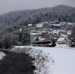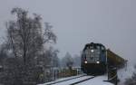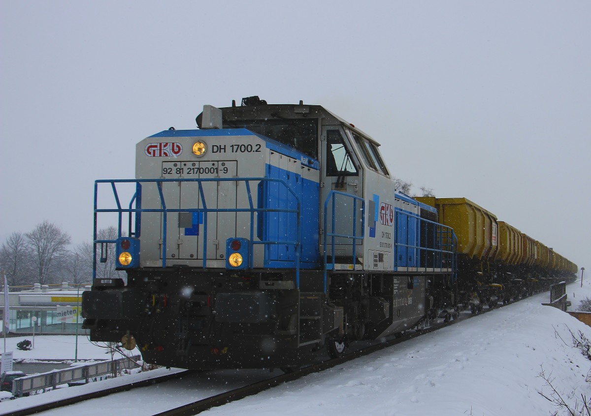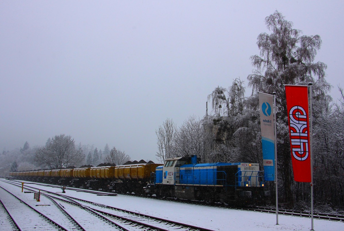 Ebenso dicht wie der Schneefall ist leider auch die Wolkendecke über Deutschlandsberg. Den goldenen Winter den wir am Wochenende erleben durften können wir uns nur zurückwünschen. Hier kommt DH 1700.2 mit einem Wagensatz Leerabraumwagen in Deutschlandsberg an. 28.01.2014 Karl Heinz Ferk
