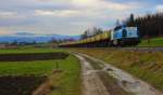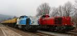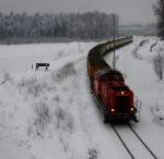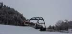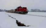Seit Jahresbeginn verkehrt das Güterzugpaar 71383/71382 nur noch 3 mal wöchentlich am Wieser Ast. Hier kurz vor St.Martin im Sulmtal Bergla hat DH1500.4 lediglich noch 2 Wagen des Typs Laaprs und den Dienstwagen als Last mit. 29.01.2014 Karl Heinz Ferk