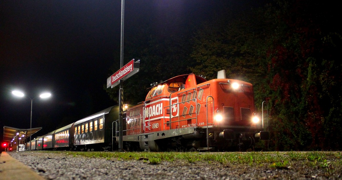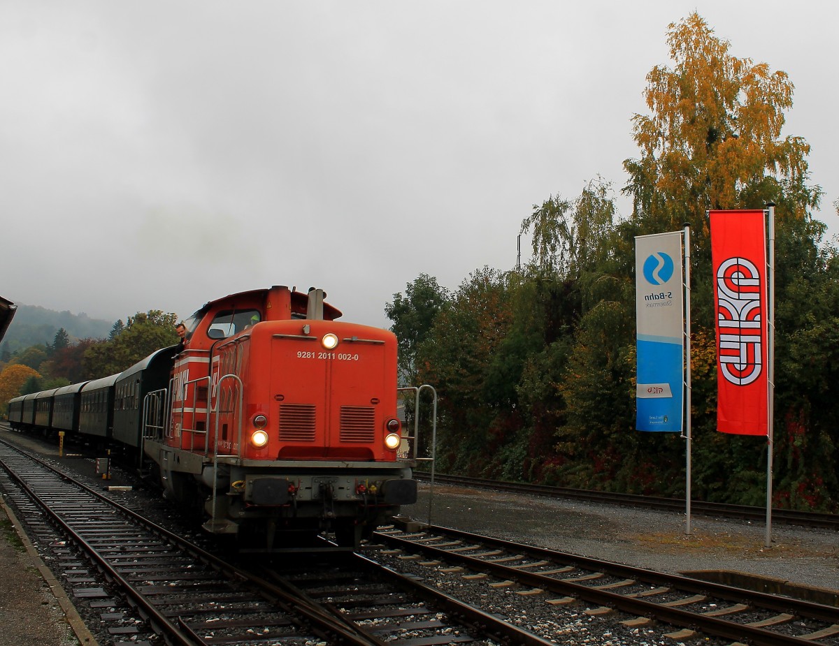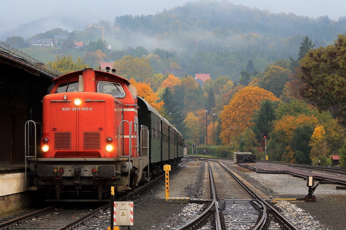 Personenzugdienste leistet die Ex V100 (GKB DH1100.2) schon einige Zeit nicht mehr. Vereinzelte Einsätze vor Doppelstockwage waren die Ausnahme ! Anders am 12.10.2013 an dem Sie vor einem Sonderzug gespannt wurde der aus lauter 2Ax Wagen bestand und von Frohnleiten nach Deutschlandsberg für eine Private Gruppe geführt wurde. ´Das zeigt einmal mehr wie Flexibel die GKB auf Sonderfahrten eingestellt ist .