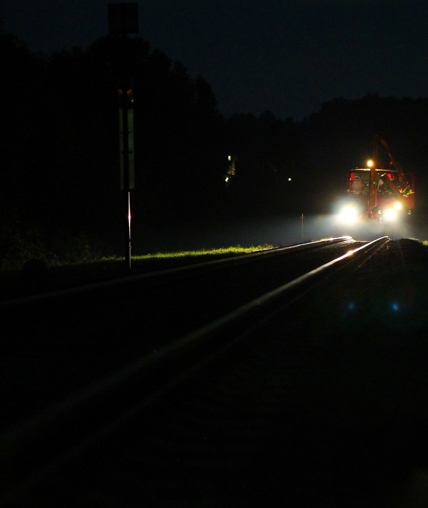 Erhgaltungsarbeiten werden bei der Graz Köflacher-Bahn groß geschrieben! Neben regelmäßigen Nachstopfarbeiten wird natürlich auch gemäht und 2*Jährlich Vegetationskontrollfahrten durchgeführt. In den letzten Tagen werden mit einem der 2Wege Unimog Freischneide Arbeiten durchgeführt. Wegen der Hohen Verkehrsdichte muss man diese natürlich Nachts durchführen. Hier zu sehen am Abend des 15.Oktober 2013 nächst der Halte und Ladestelle Schwanberg.