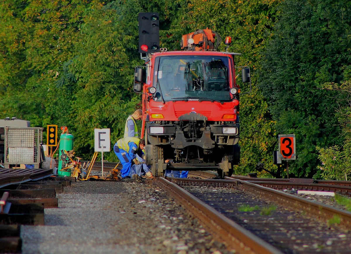 Und da sag noch einer ein Schienenfahrzeug kann keinen Patschen haben ! Schaut doch zumindest so aus als würde man dem 2Wege Unimog den Reifen wechseln. Eine Arbeiterrotte bei der Arbeit auf Gleis 2 im Bahnhof Deutschlandsberg am Morgen des 1.Oktober 2013
