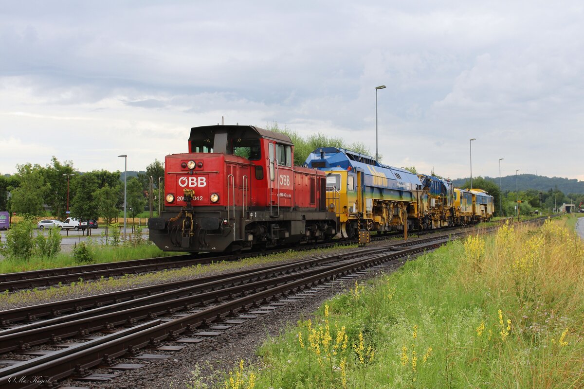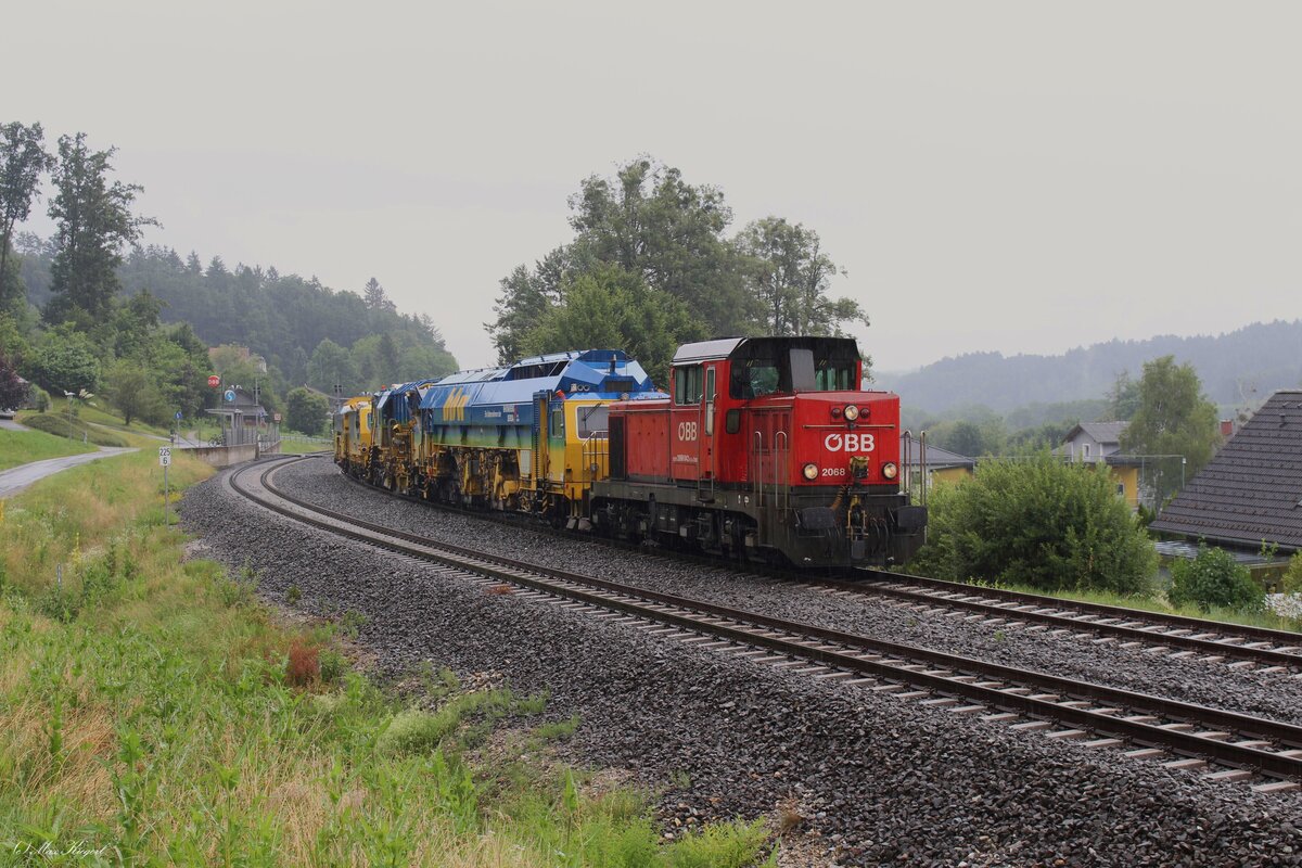 Nachdem die 2068 042 mit einer Plasser&Theurer Stopfmaschine am 27.6.2024 den Bahnhof Laßnitzhöhe erklommen hat ging es nach einem Kreuzungshalt weiter nach Graz Vbf, wo ein Triebfahrzeugwechsel stattgefunden hat. Max Kiegerl