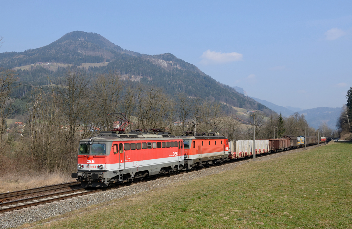 1142 624 sowie 1144 066 waren 24. März 2015 mit der Aufgabe betraut einen gemischten Güterzug von Linz nach Graz zu bringen, dabei wurden sie von mir in Peugen bei Frohnleiten fotografiert.