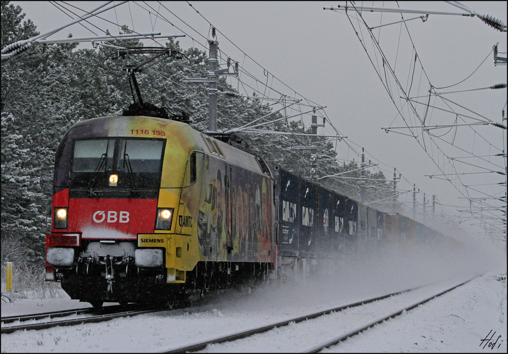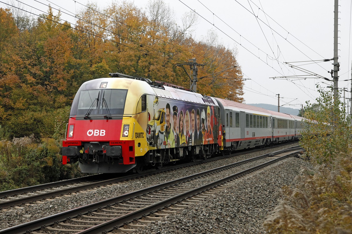 Seit dem 14.10.2013 besitzen die ÖBB eine neue Werbelok. Auf der 1216.141 werben ÖBB und ÖAMTC "Gemeinsam für eine sichere Mobilität" Das Bild zeigt die Lok bei ihrer ersten Ausfahrt am 14.10.2013 mit EC159 kurz vor Gloggnitz. Herbert Pfoser