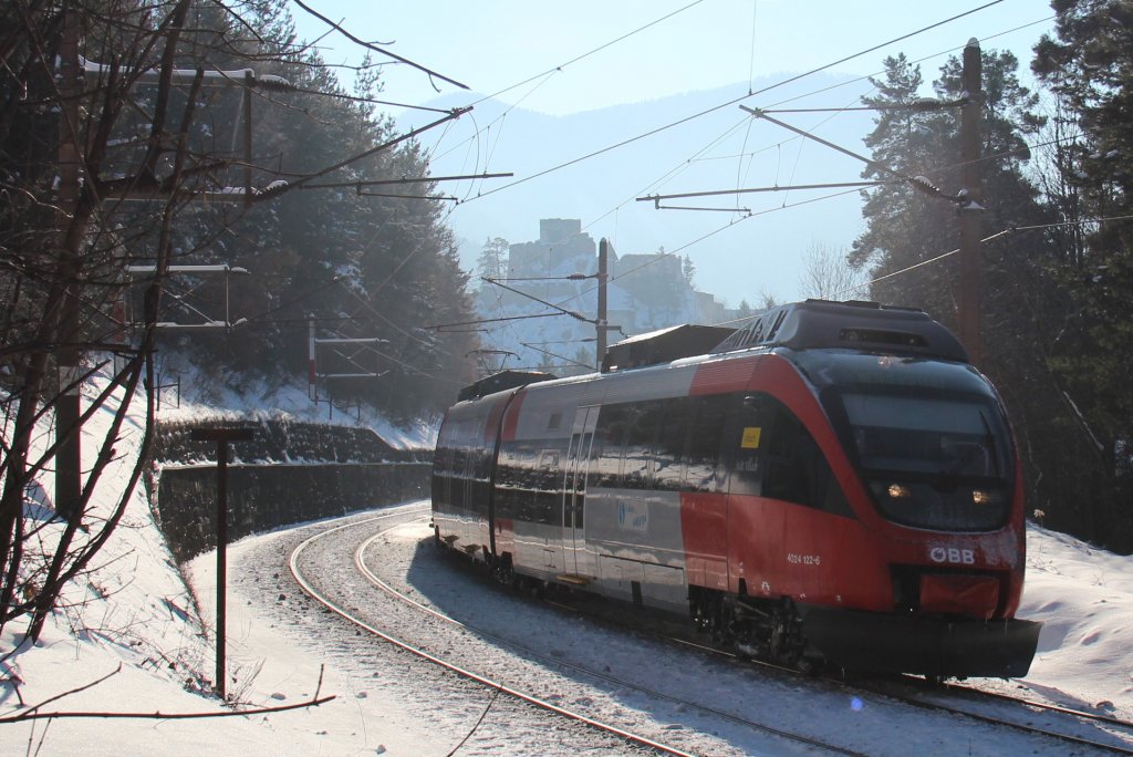 Der Eingeschobene LP 98440, als 4024 122 von Wien Meidling (Mi) nach Villach Hauptbahnhof (Vb), hier zum sehen kurz vor dem Übersetzen des Wagnergrabenviadukt; am 19.01.2013