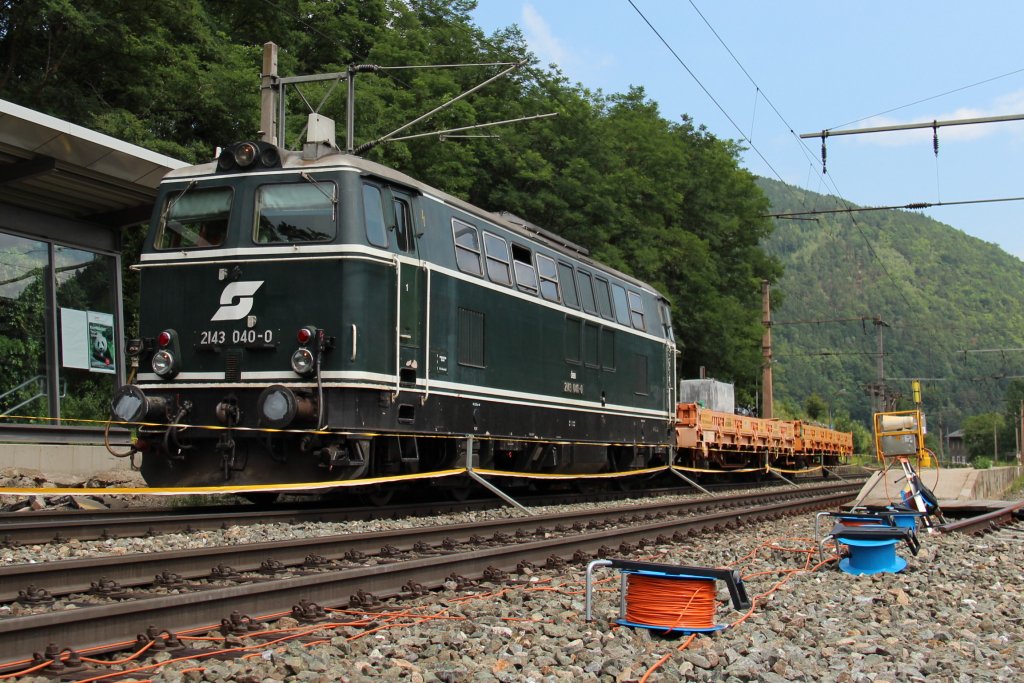2143 040 vor einem Bauzug zw den Bahnhöfen Gloggnitz und Payerbach-Reichenau zu sehn, aufgenommen in der Haltestelle Schlögmühle; am 30.07.2012 Florian Kubele