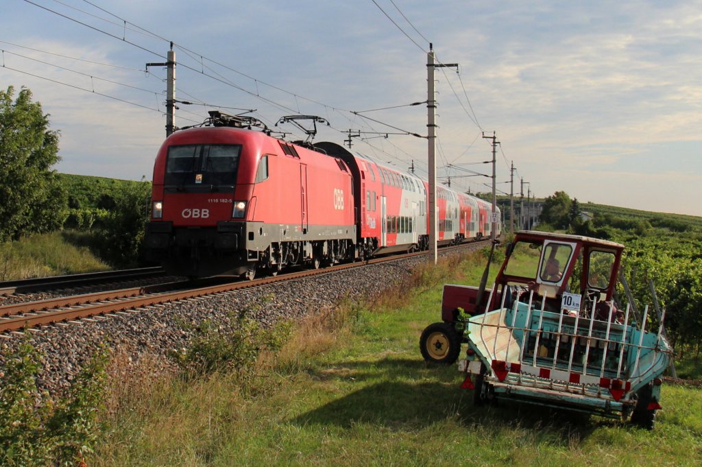 Die Gumpoldskirchner Weinbauern interessieren sich auf für Züge. 1116 182 fuhr mit dem R 2311 "EVN Energieexpress" von Breclav nach Wiener Neustadt Hauptbahnhof kurz nach dem "Busserltunnel" ihren nächsten Halt Baden entgegen; am 30.07.2012 Florian Kubele
