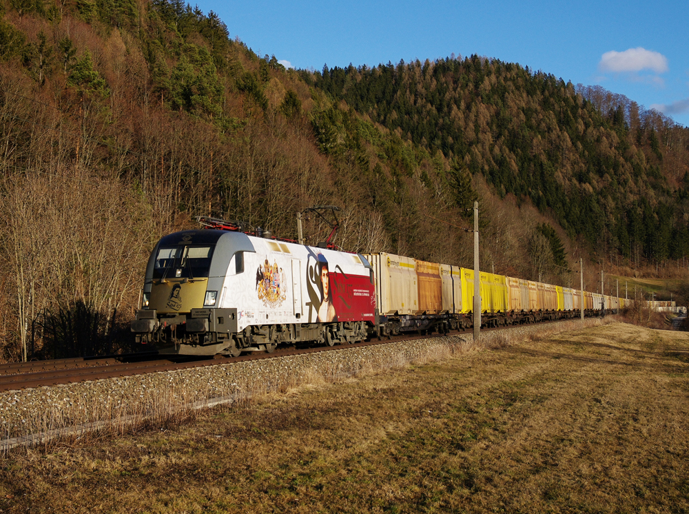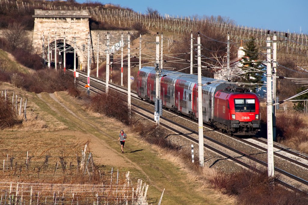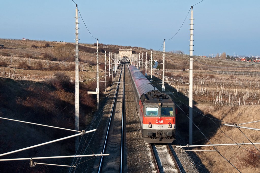 1216 233 ist mit dem EC 77 von Prag nach Wr. Neustadt unterwegs. Die Aufnahme enstand am 02.03.2012 kurz vor Pfaffstätten, mit dem sogenannten "Busserltunnel" im Hintergrund. Gerhard Zant