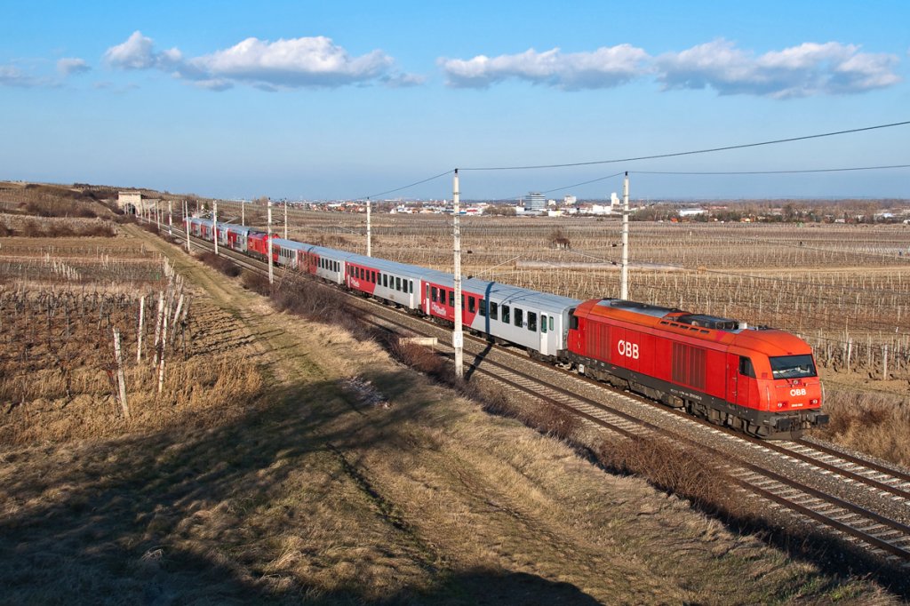 Zwei Züge sind zwischen Wien Meidling und Wr. Neustadt Hbf. gemeinsam unterwegs. REX 2791 nach Hartberg und REX 7751 nach Neckenmarkt-Horitschon, am Nachmittag des 02.03.2012 kurz vor Pfaffstätten. Gerhard Zant