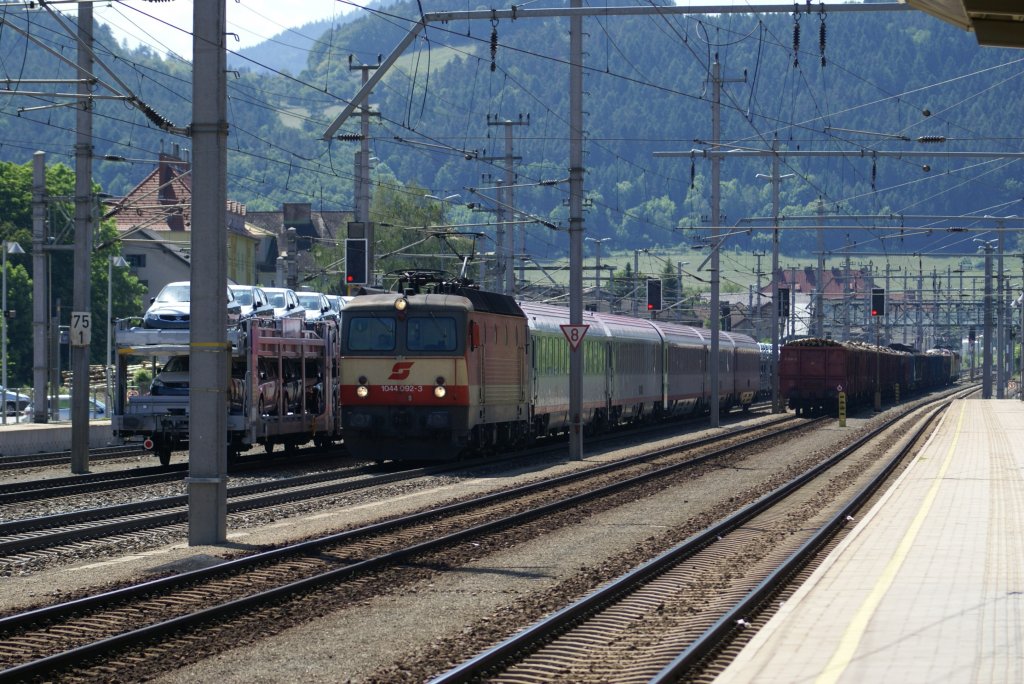 1044 092 hat den Semmering hinter sich gelassen und fahrt jetzt mit dem IC654 durch den Bahnhof Gloggnitz seinen nächsten Halt entgegen. Ziel des Zuges ist Wien Meidling. 6.5.2010