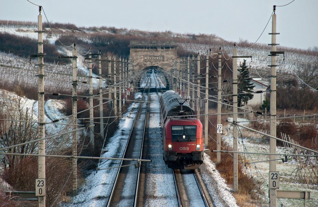 1116 088 hat mit R 2315 den Busserltunnel hinter sich gelassen und ist  nach Wr. Neustadt Hbf. unterwegs. Die Aufnahme entstand am 27.11.2010 zwischen Gumpoldskirchen und Pfaffstätten.