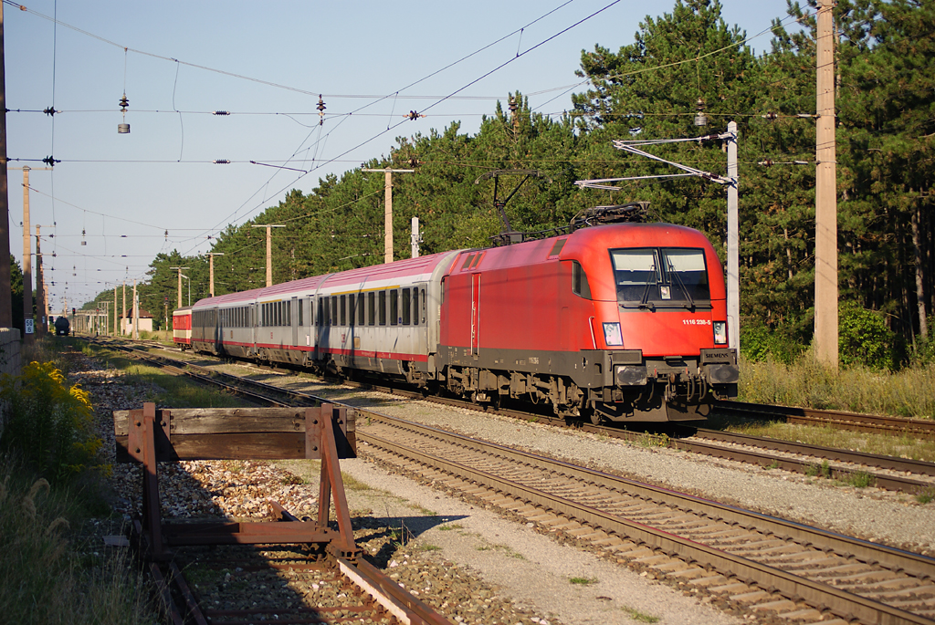1044 084 befördert den OIC 659 von Wien nach Graz. Wenn man genau hinschaut, kann man die vier Schlierenwagen erkennen, welche am Zugende eingereiht waren. Pfaffstätten, am 26.08.2010.