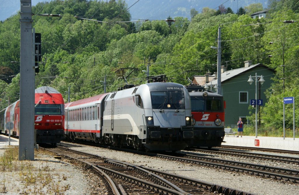 Railjet-Testlok  1016 034 fahrt mit dem IC652 von Graz gerade kommend durch den Bahnhof Payerbach-Reichenau Wien entgegen. 6.5.2010