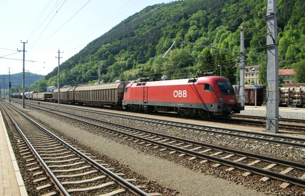 Taurus 1116 256 hat den Semmering hinter sich gelassen und fahrt gerade mit einem Güterzug bestehend aus Schiebewandwagen durch den Bahnhof Gloggnitz. 6.5.2010