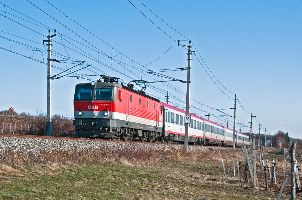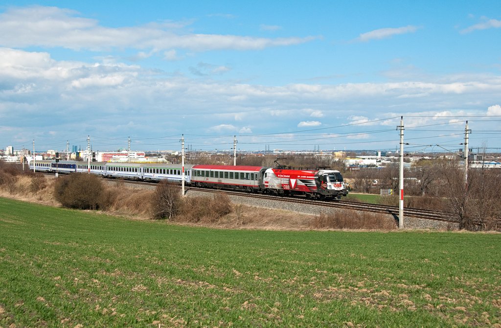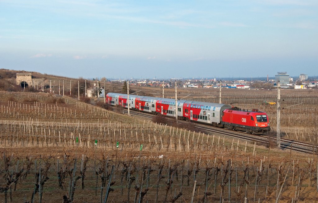 1116 159 befördert den OEC 151 "Emona" Richtung Süden, während EN 234 "Allegro Tosca" aus Rom nur mehr wenige Kilometer von seinem Endbahnhof entfernt ist. Die Aufnahme entstand am 21.02.2010 zwischen Gumpoldskirchen und Pfaffstätten. Gerhard Zant
