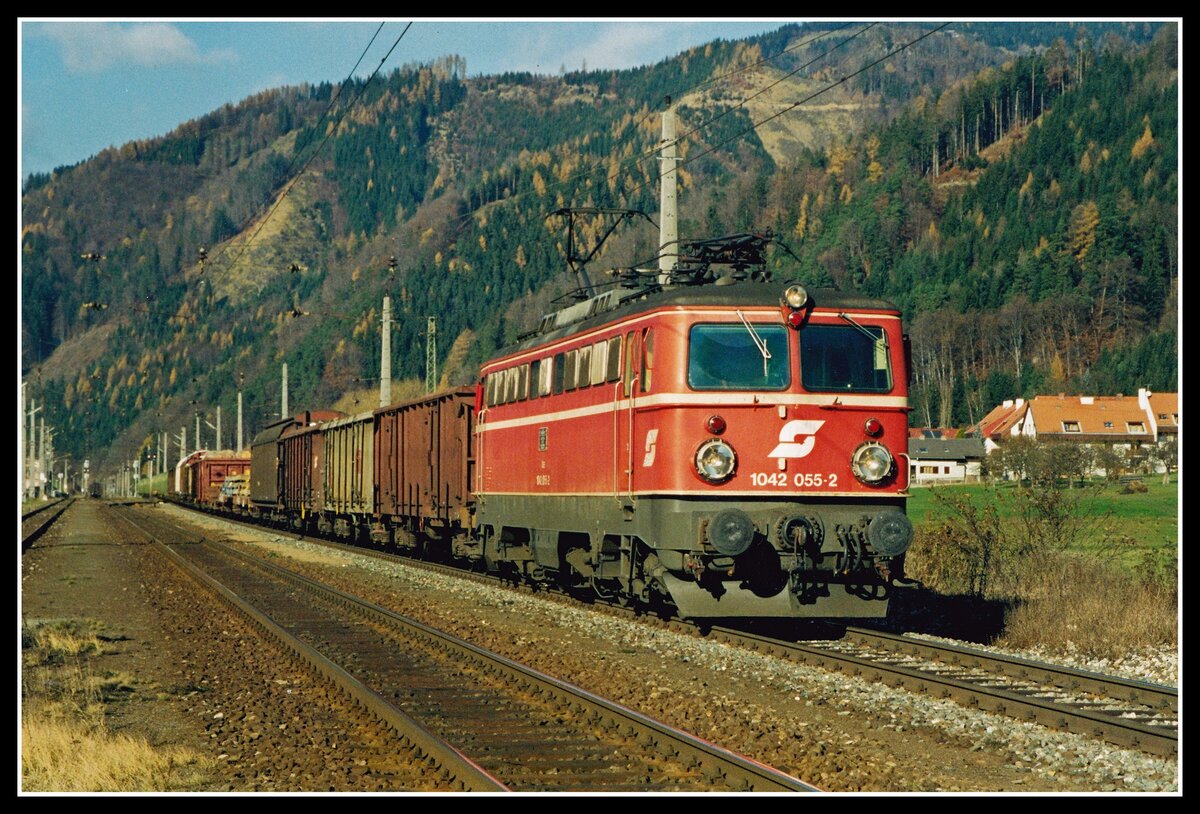 Der Güterzug hatte auf seinem Weg von Wien Zvb nach Graz Vbf von Gloggnitz bis Kapfenberg eine 1144er als Vorspanntriebfahrzeug, das hier vom Zug ging. Max Kiegerl