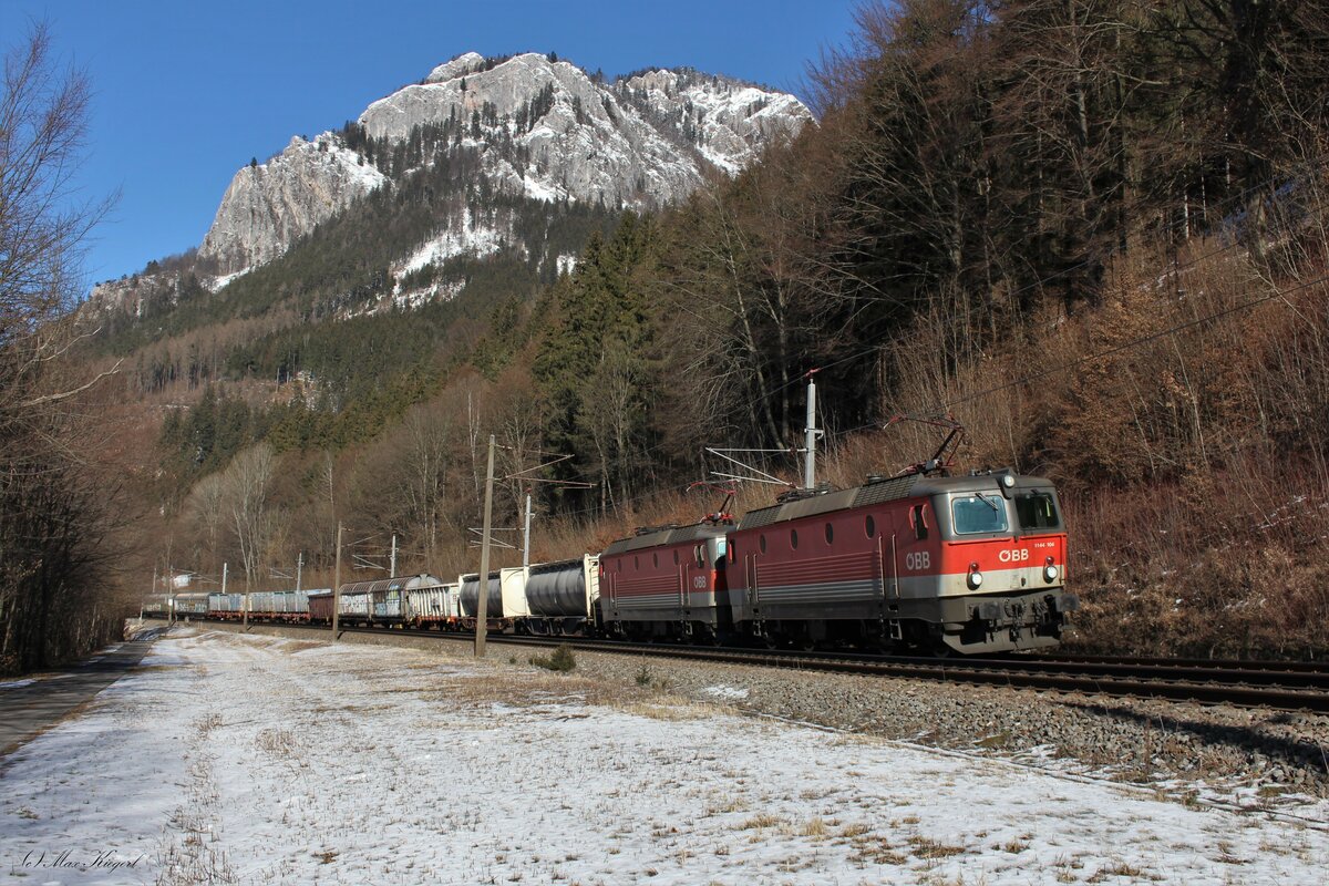 Vor der gewaltigen Kulisse des Röthelsteins stehen die 1144 104 und 1144 110 mit dem DG54703 auf ihrem Weg von Wien Zvb nach Graz Vbf beim Block Mixnitz 1 und warten auf die Weiterfahrt. Max Kiegerl