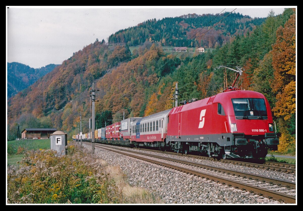Bespannt war der Containerganzzug von Spielfeld-Straß bis Brečlav mit der 1116 142 und von Kapfenberg bis Gloggnitz half die 1144 212 als Vorspanntriebfahrzeug. Max Kiegerl