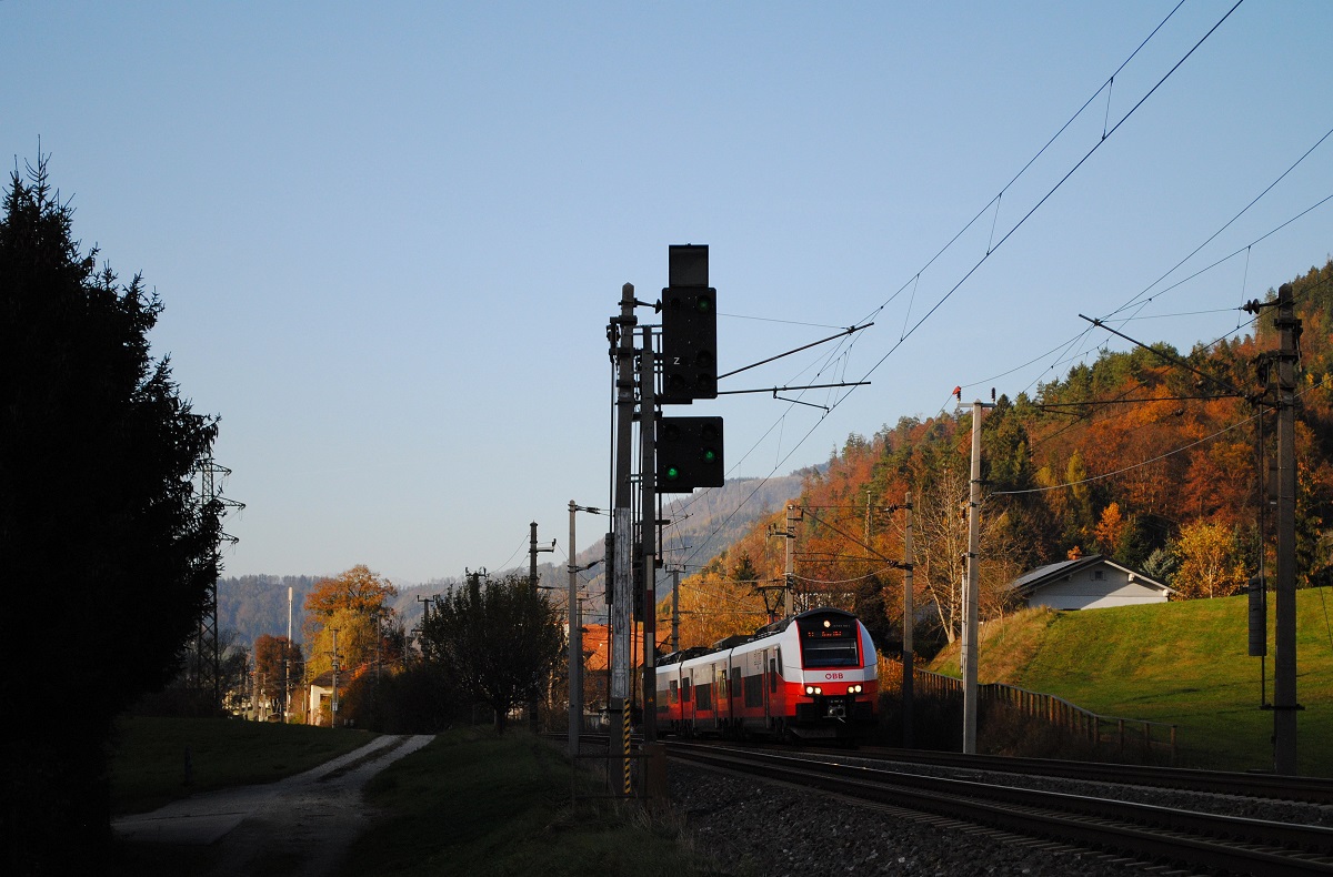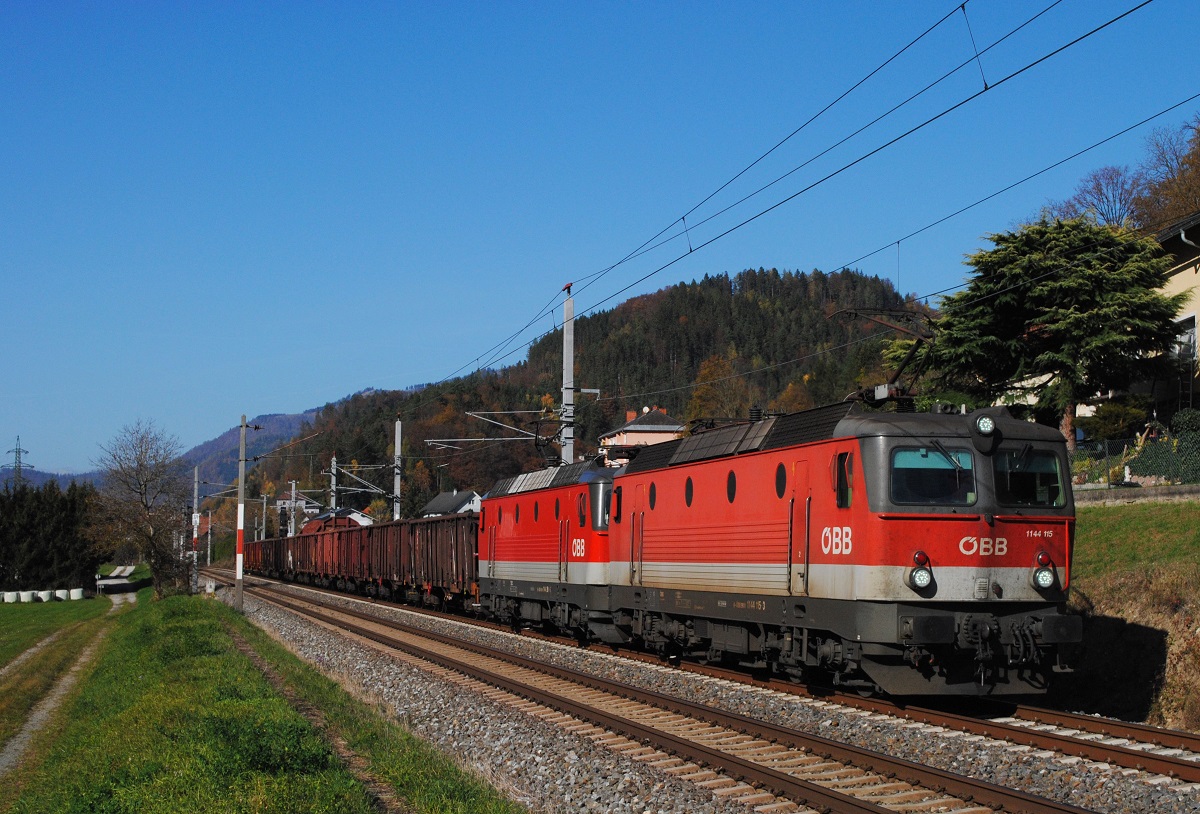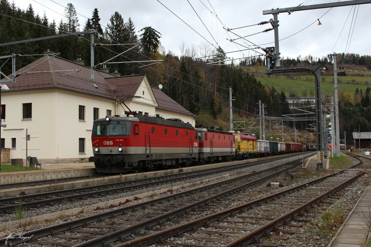 Nachdem die 1144 265 und die 1144 008 mit dem grenzlastigen DG54703 am 18.11.2022 den Bahnhof Breitenstein erreicht haben wartet der Zug die Vorfahrt eines Railjets ab und die beiden "Alpenstaubsauger" kämpfen sich weiter Richtung Semmering bergwärts und dem Ziel Graz Vbf entgegen. Max Kiegerl