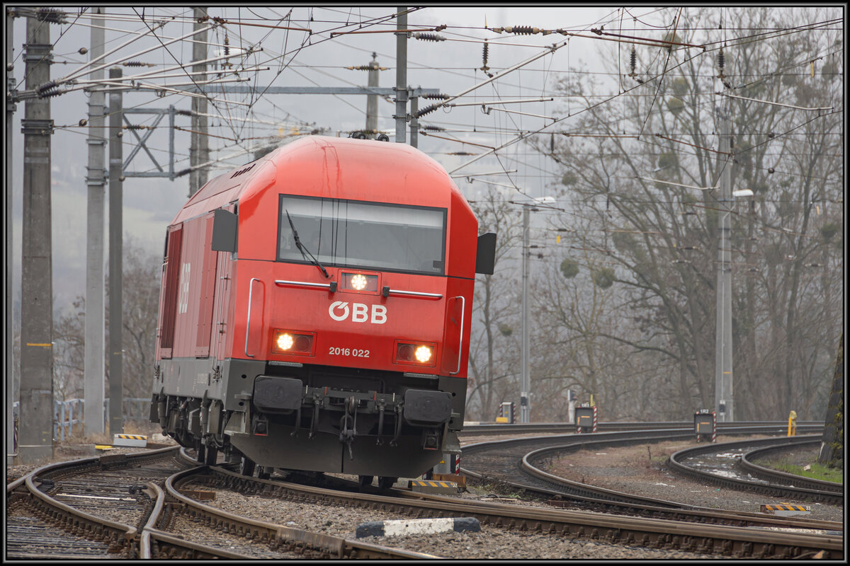 Im nebeligen Bahnhof Wildon wartet am 8.11.2022 die 2016 094 mit dem VG76721 von Kalsdorf nach Spielfeld-Straß auf einen Kreuzungszug und die Weiterfahrt ihrem Ziel entgegen. Max Kiegerl
