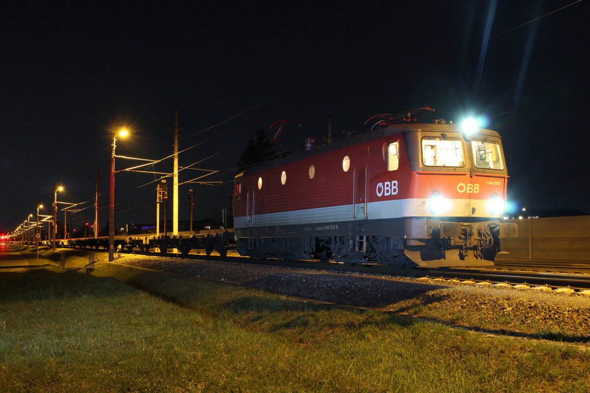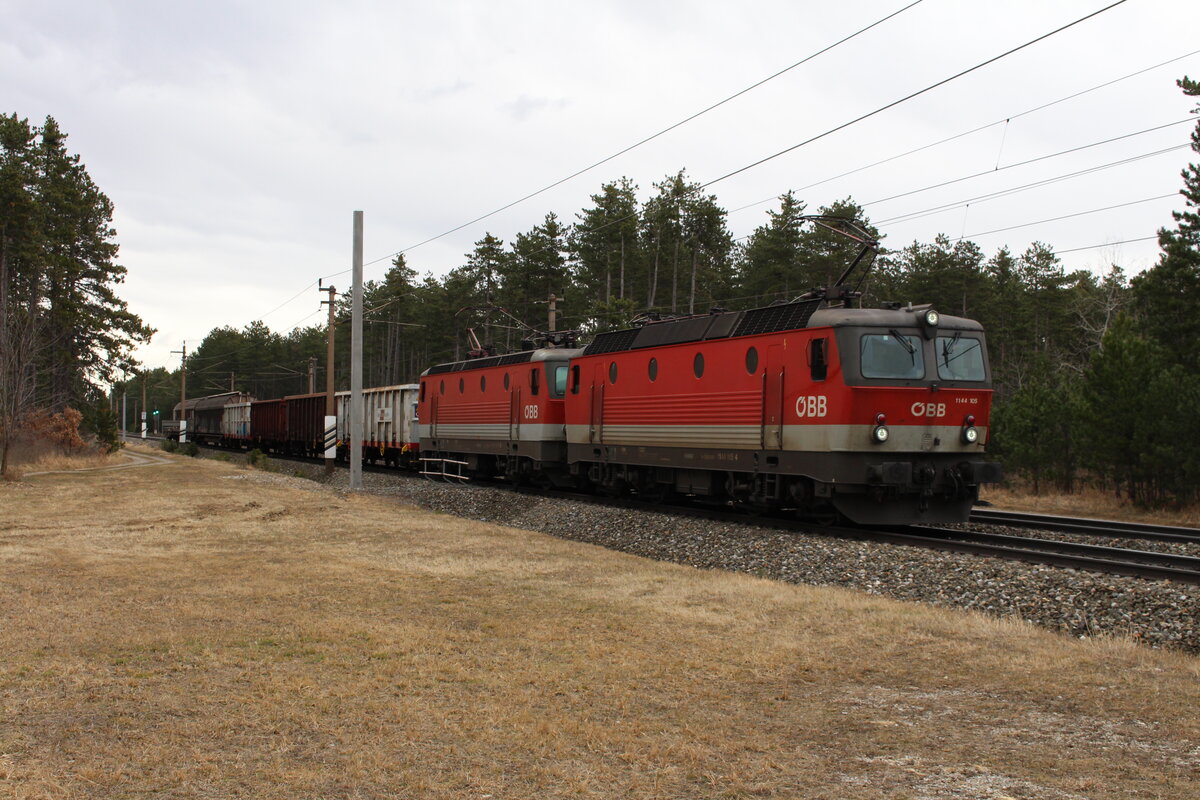 Bespannt wurde der knapp 450t schwere Zug von der 1144 105 und 1144 035 die hier bei der Überleitstelle Wiener Neustadt 2 (Üst Nb2) wegen Eingleisigkeit kurz zum Stehen kamen Max Kiegerl