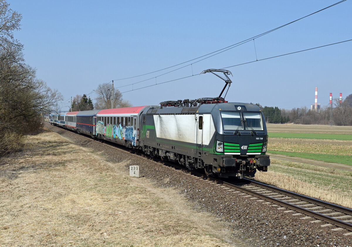 Am 24. März 2022 ist 193 730 mit EC 151 (Wien Hbf - Ljubljana - Trieste c.le.) unterwegs und hat vor wenigen Augenblicken den Bahnhof Leobersdorf passiert. F. Lackner