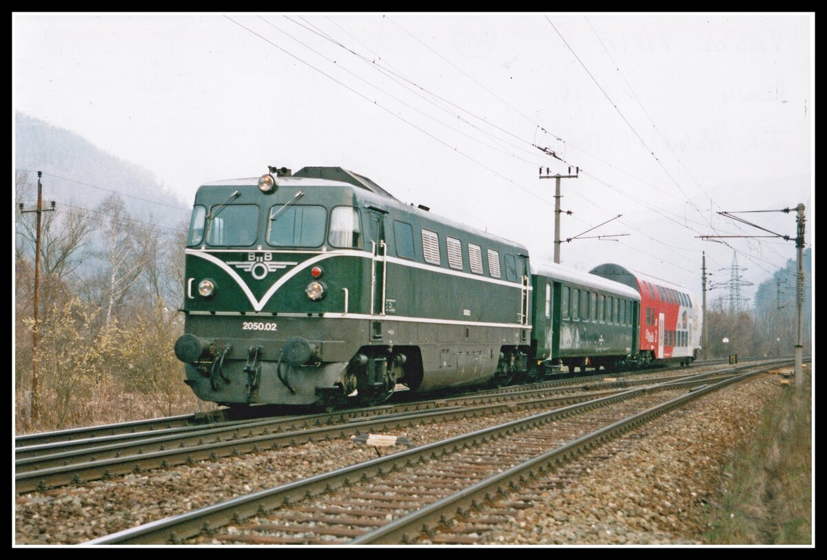 Eine ganz besondere Fuhre hatte die 2050.02 am 30.03.2004 am Zughaken. Mit einem grünen Nostagieschlieren und einem Doppeltockwagen fuhr sie bei Mixnitz Richtung Graz. Herbert Pfoser