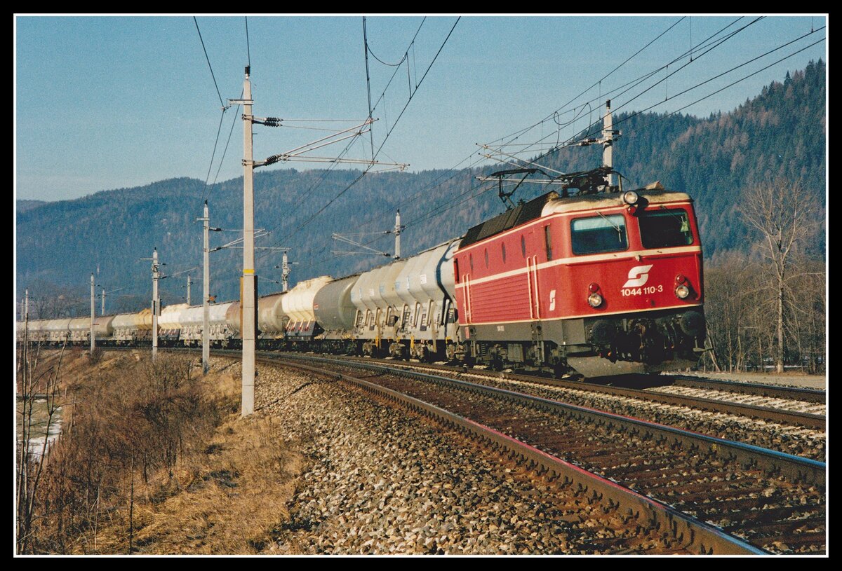 1044 110 ist am 5.02.2002 mit einem Güterzug zwischen Mitterdorf - Veitsch und Krieglach durchs Mürztal unterwegs. Damals herrschte im Mürztal noch Linksverkehr. Seit ca 2 Jahren wurde das Regelgleis geändert und alle Züge fahren rechts.