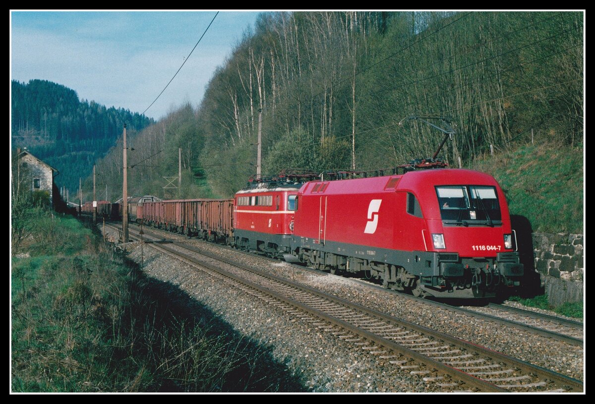 1116 044 + 1042 007 (geschleppt)fahren am 29.04.2003 mit G40480 bei Spital am Semmering Richtung Norden. Im Bild ist noch die alte Fahrleitung aus der Zeit der Elektrifizierung mit den orangenen Masten zu sehen. In der Zwischenzeit wurde die Fahrleitung erneuert und entspricht dem ÖBB-Standard.