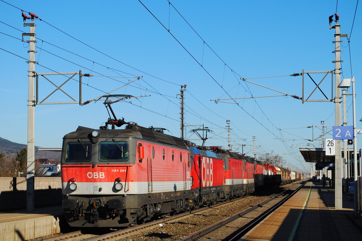1144 284-7 + 1293 049-3 + 1144 237-5 + 1144 249-0 + 1144 049-4 + Güterzug bei der Durchfahrt durch Baden b. Wien. (07.01.2022)
