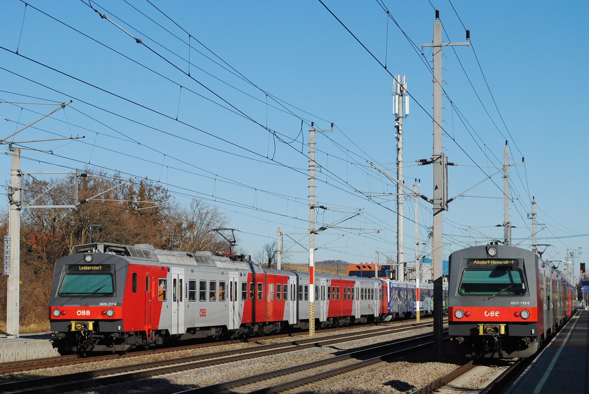 Begegnung zwischen den verkehrsrot lackierten 4020 317 und 4020 283 im Bhf. Pfaffstätten. (07.01.2022)