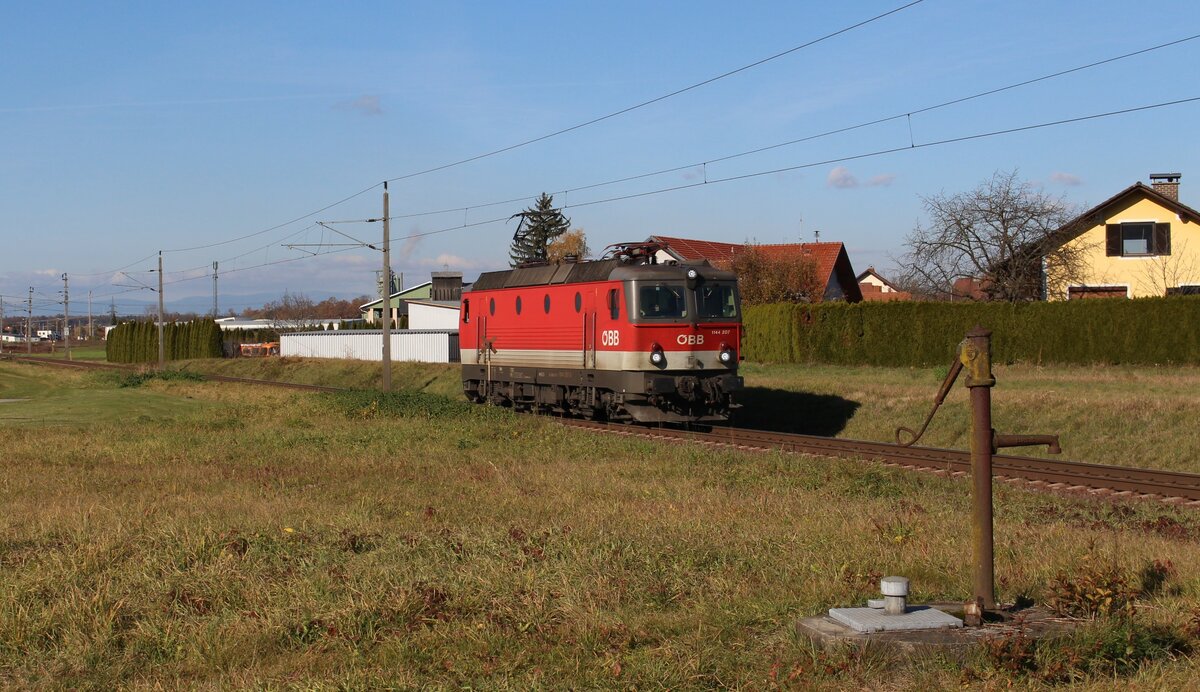 Die 1144 207 fuhr am 9.11.2021 als SLZ18206 von Graz nach Spielfeld-Straß um der GAG47422 von dort nach Gratwein-Gratkorn zu bringen. Bei Neudorf ob Wildon eilt das Triebfahrzeug bei einem alten Pumpbrunnen vorbei.