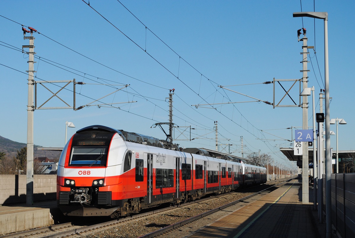Die aus den 4746 072 + 4746 073 bestehende Garnitur der S3 verläßt als R 29429 die Haltestelle Baden bei Wien. (07.01 2022)