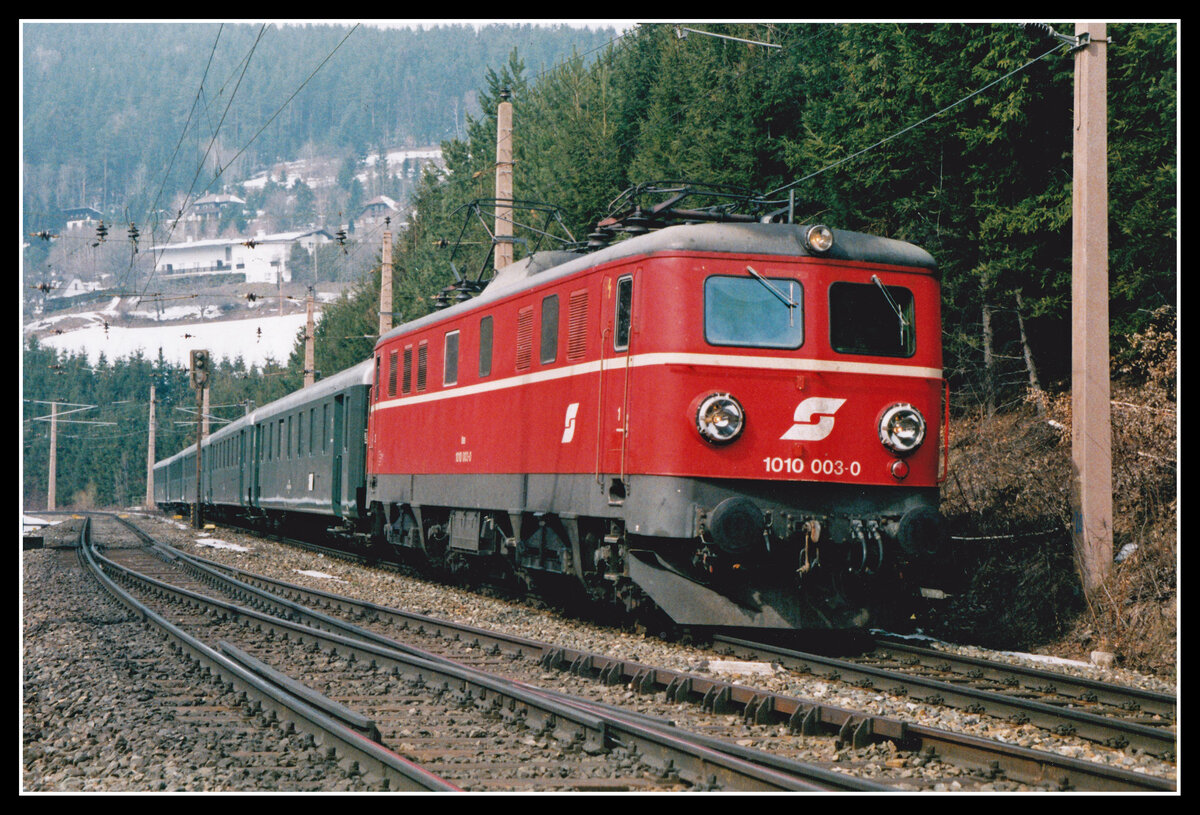 Die  Zauberbergzüge  waren ein Produkt der ÖBB-Erlebnisbahn, sie fuhren an Wochenende auf der Semmering - Gebirgsbahn und waren jeweils mit besonderen Triebfahrzeugen bespannt.Diese Züge hielten sich einige Jahre im Fahrplan bis die Erlebnisbahn aufgelöst wurde. Im Bild ist die 1010 003 mit dem Zauberbergzug am 13.03.2004 in Klamm - Schottwien zu sehen.