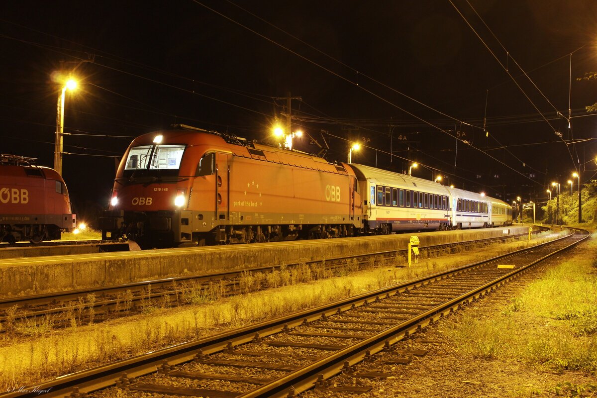 Die 1216 145 brachte am Abend des 27.8.2024 den EN414 von Dobova bis nach Selzthal hier beim Aufenthalt in Spielfeld-Straß. Max Kiegerl