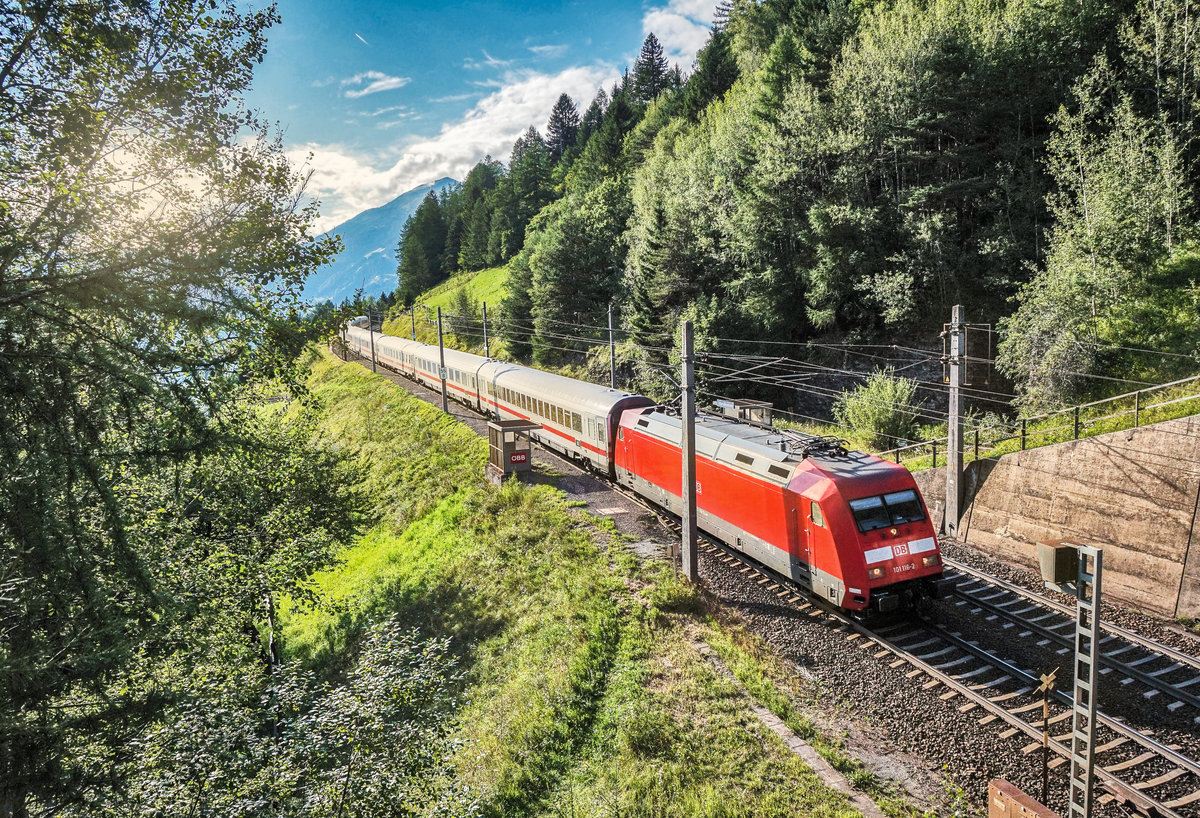 101 116-2 durchfährt mit dem EC 115 "Wörthersee" (Münster (Westf) Hbf - Klagenfurt Hbf) die Haltestelle Oberfalkenstein.