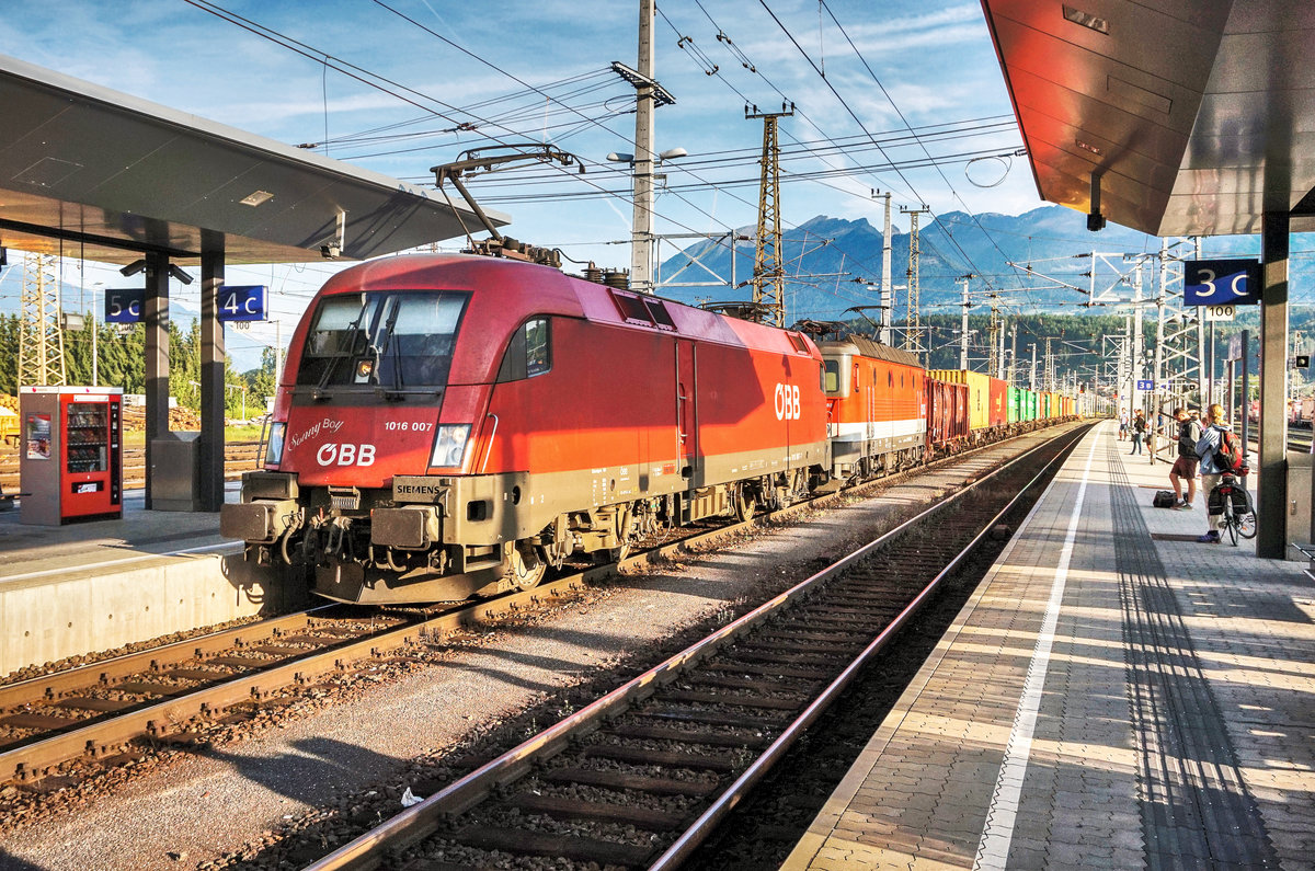 1116 120-7 und 1116 263-5 fahren mit einem Güterzug, kurz vor der Haltestelle Oberfalkenstein, die Tauernbahn-Südrampe hinunter.